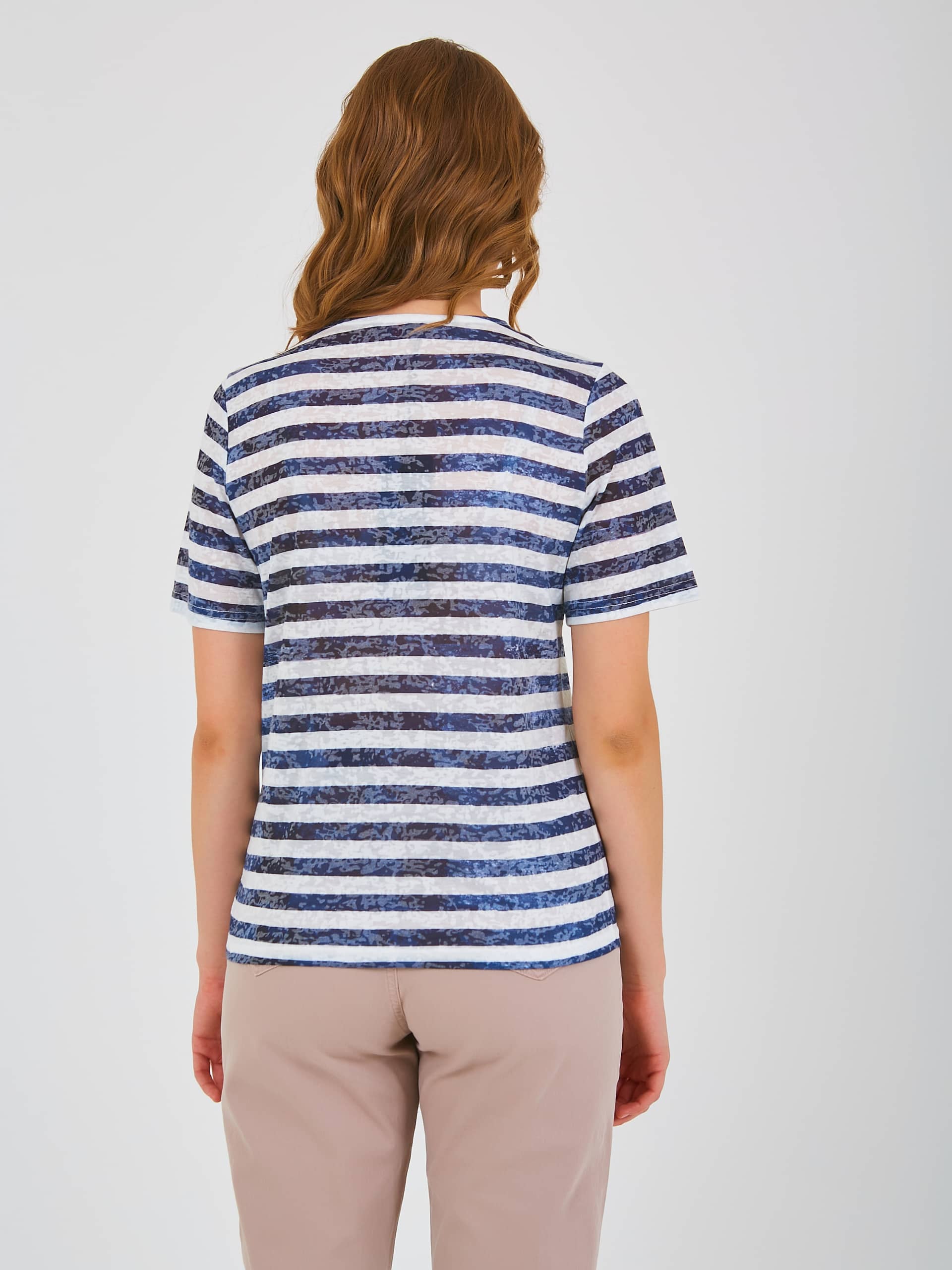 Футболка средней длины прямого силуэта из полиэстера с добавлением мягкой вискозы, дизайнерская особенность модели – принт в полоску и фактурный трикотаж. По переду выполнен яркий морской принт. Укороченные втачные рукава. Круглый вырез горловины.