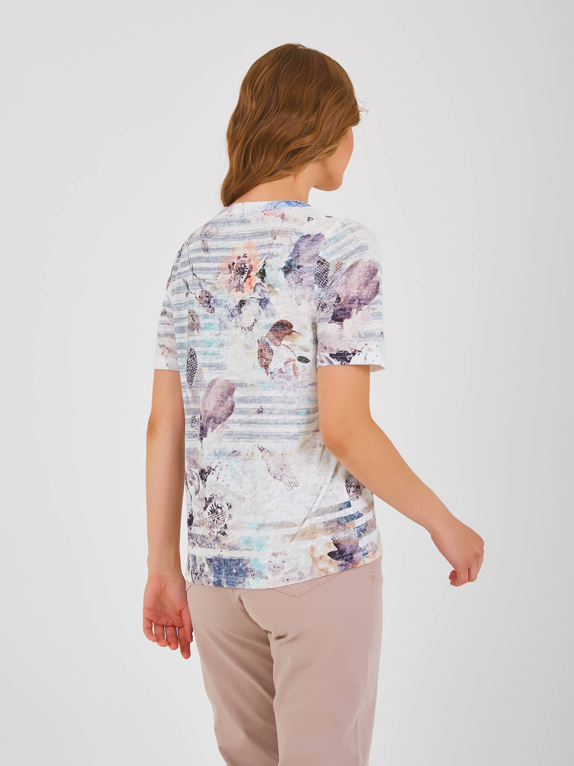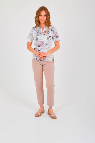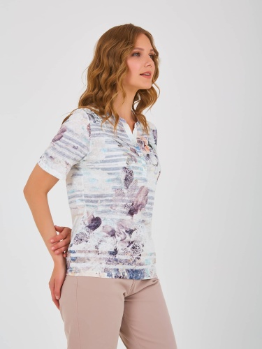 Футболка средней длины прямого силуэта из полиэстера с добавлением мягкой вискозы, дизайнерская особенность модели – растительный принт и фактурный трикотаж. Укороченные втачные рукава. Круглый вырез горловины с разрезом и планкой на три прорезные петли и пуговицы.