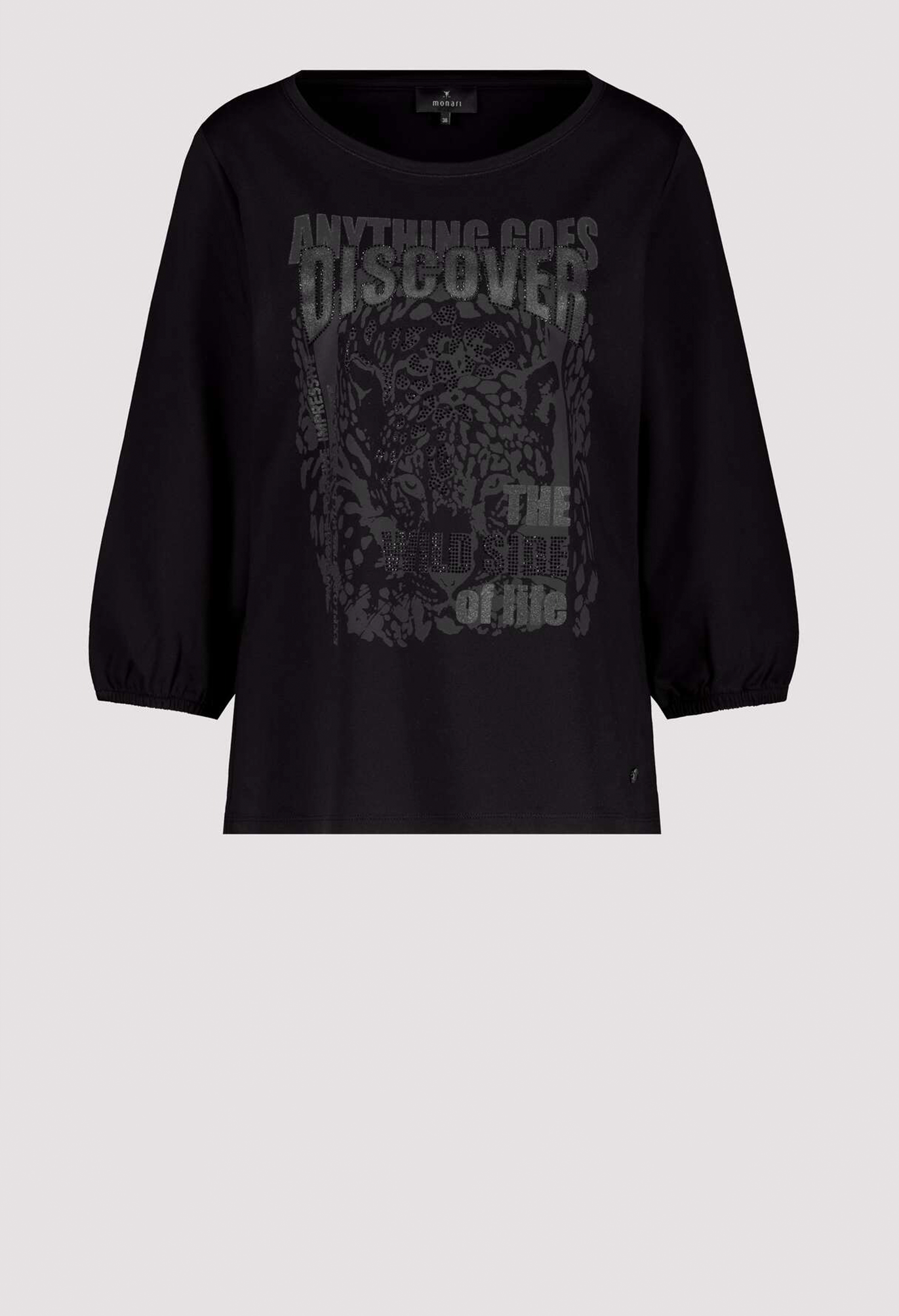 Мягкая на ощупь и оптимальная посадка, рубашка с рукавом 3/4 удобна в ношении. Она декорирована леопардовым узором в тон с надписью блестками. Круглый вырез горловины со швом из блестящего люрекса. Подол рукава на резинке. Длина 44 размера 62 см.
