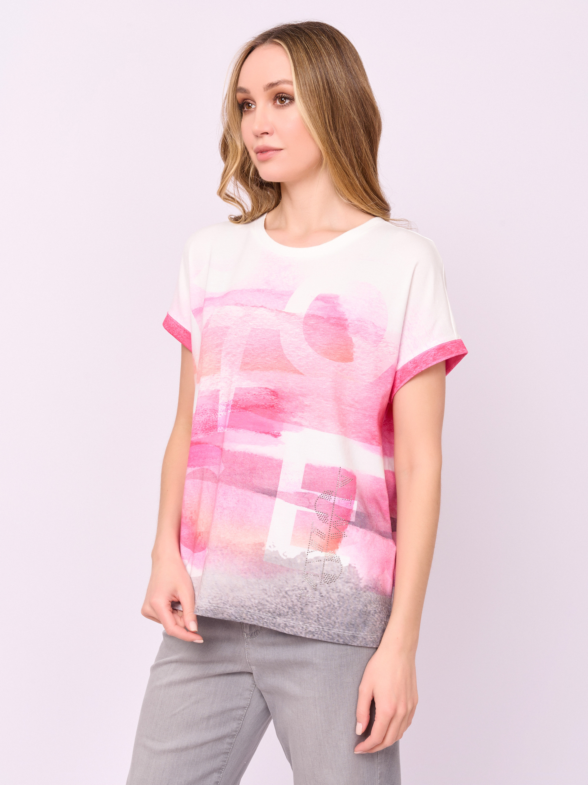 Детали: вырез горловины округлый, покрой прямой, рисунок абстракция, без надписи, стразы. Длина по спинке: 58 см.
