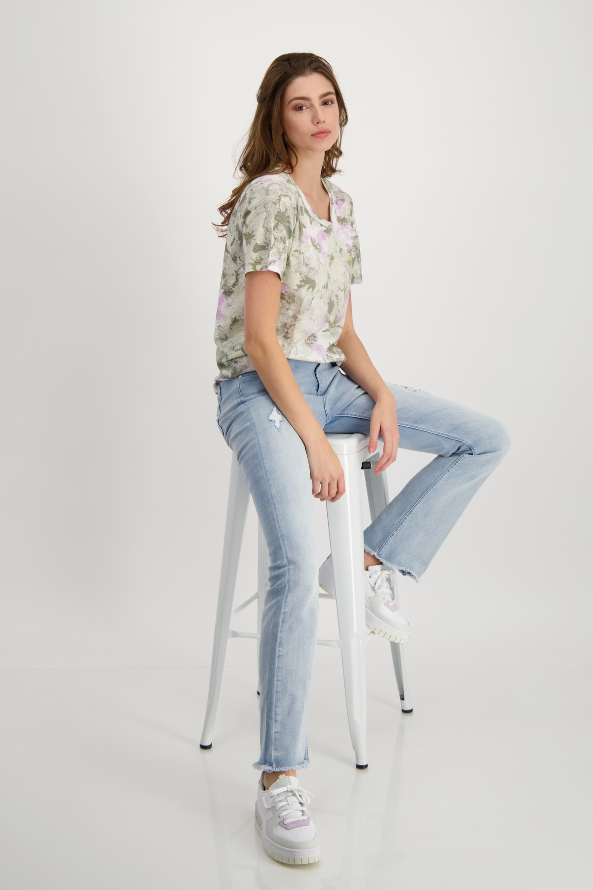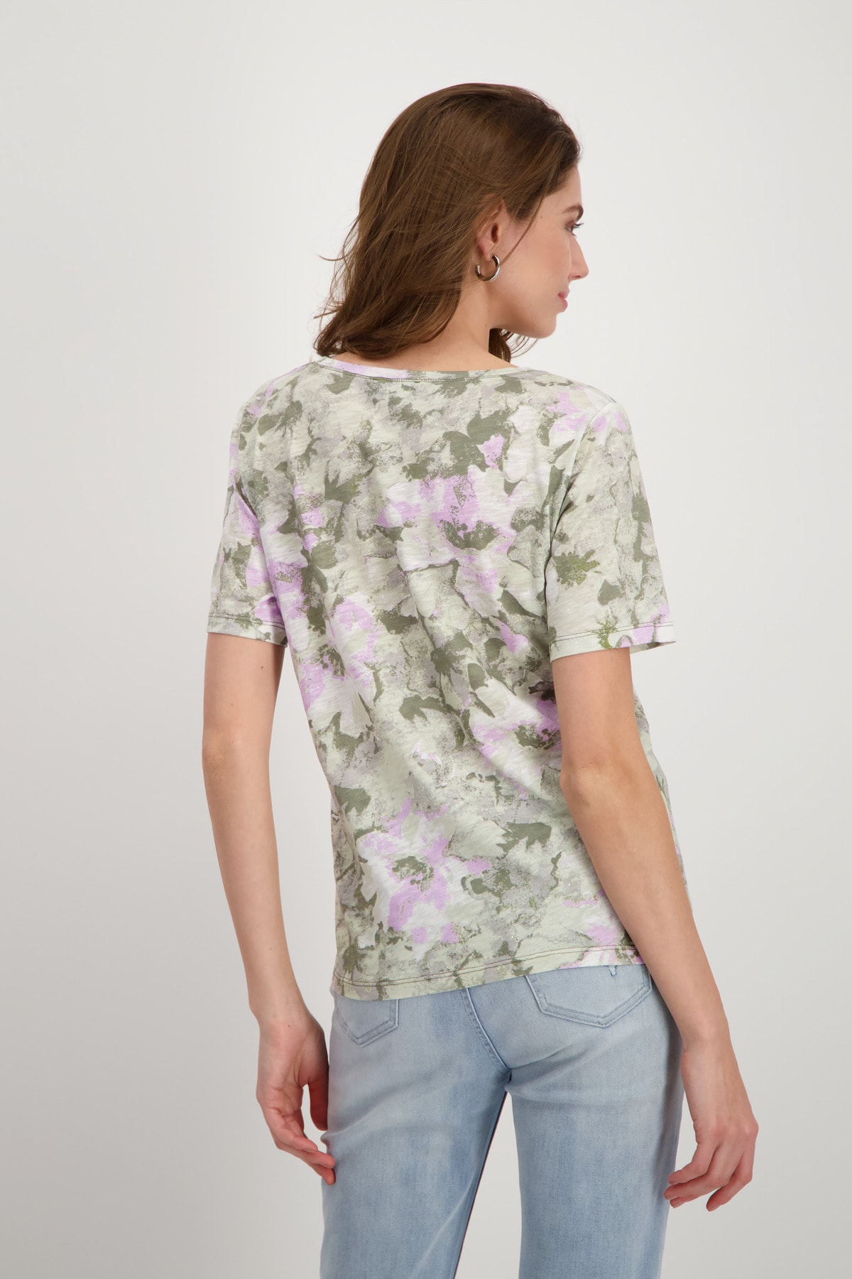 Эта мягкая футболка со стильным цветочным узором имеет усовершенствованный боковой шов. Высококачественная смесь хлопка. Регулярная посадка. Круглый вырез. Короткий рукав. Длина 44 размера 62 см.