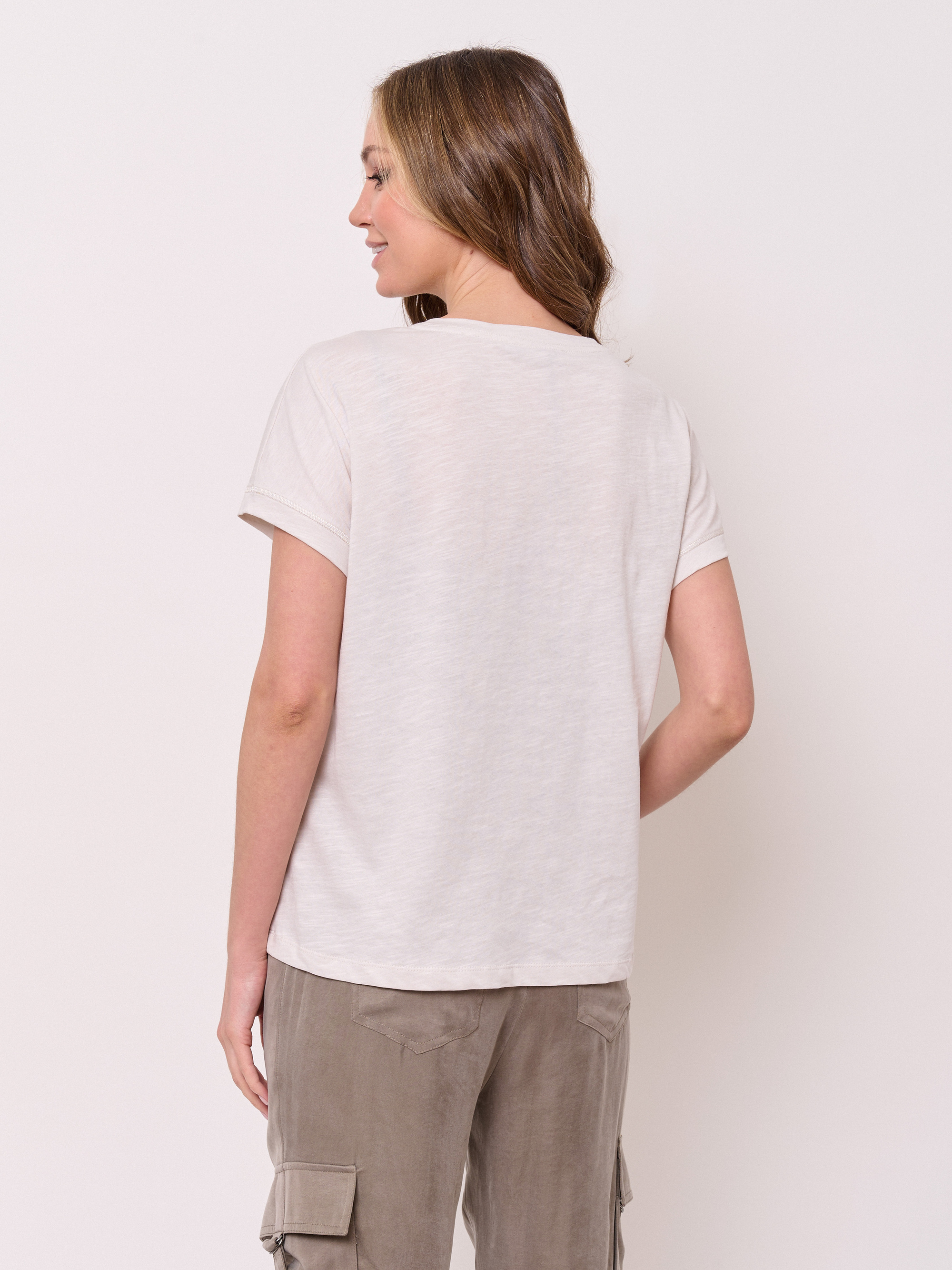 Детали: вырез горловины округлый, покрой прямой, рисунок цветы и растения, наличие надписи с надписью, рукава короткие цельнокроеные. Длина по спинке: 58 см.