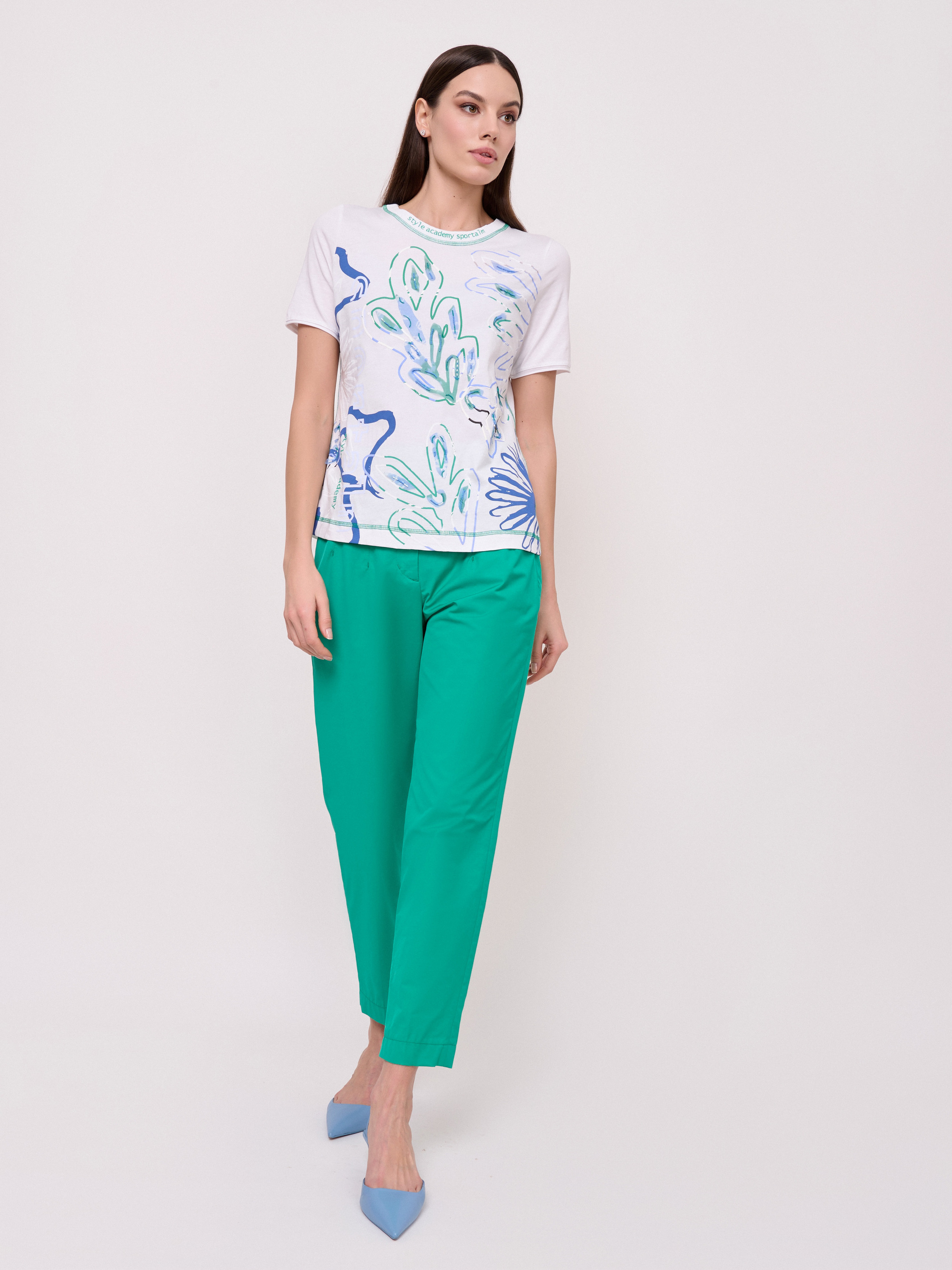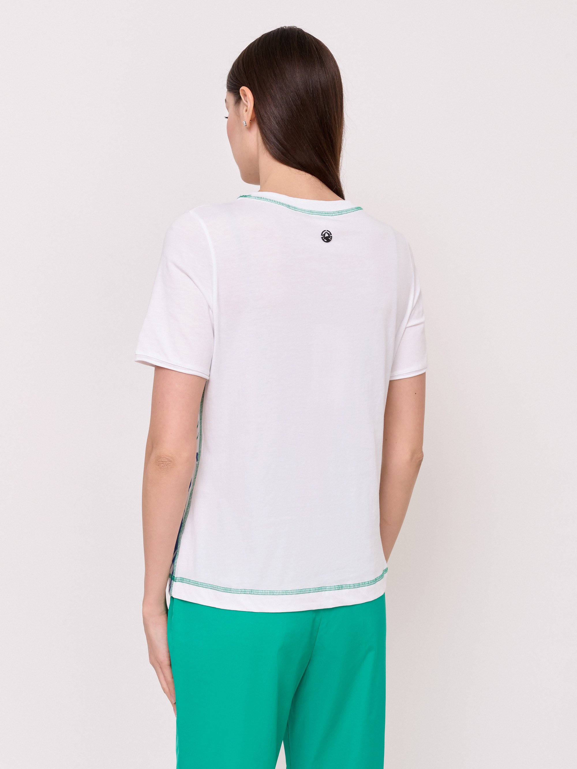 Детали: вырез горловины округлый, покрой полуприталенный, рисунок цветы и растения, наличие надписи с надписью, вышивка бисером, аплликации. Длина по спинке: 59 см.