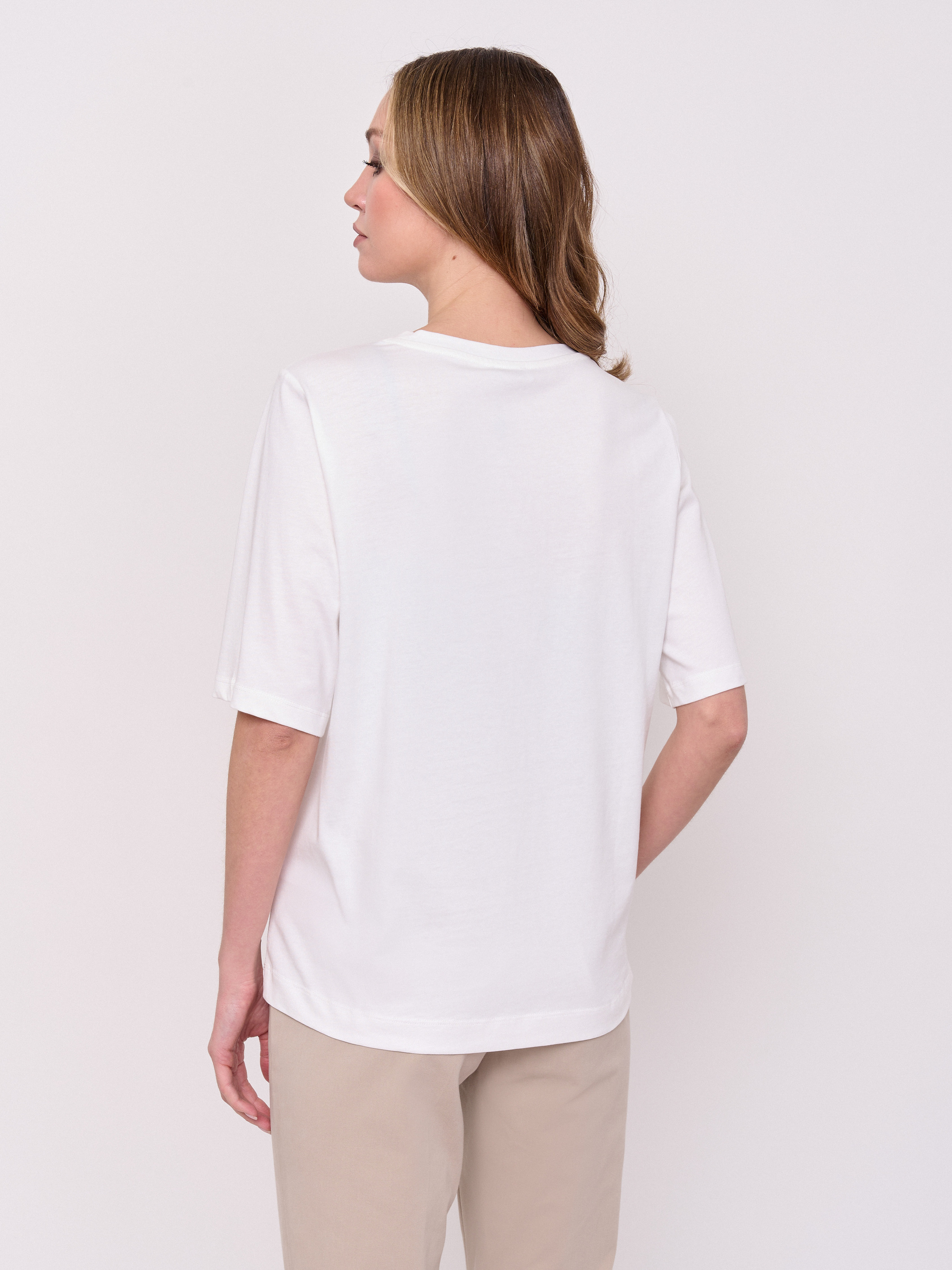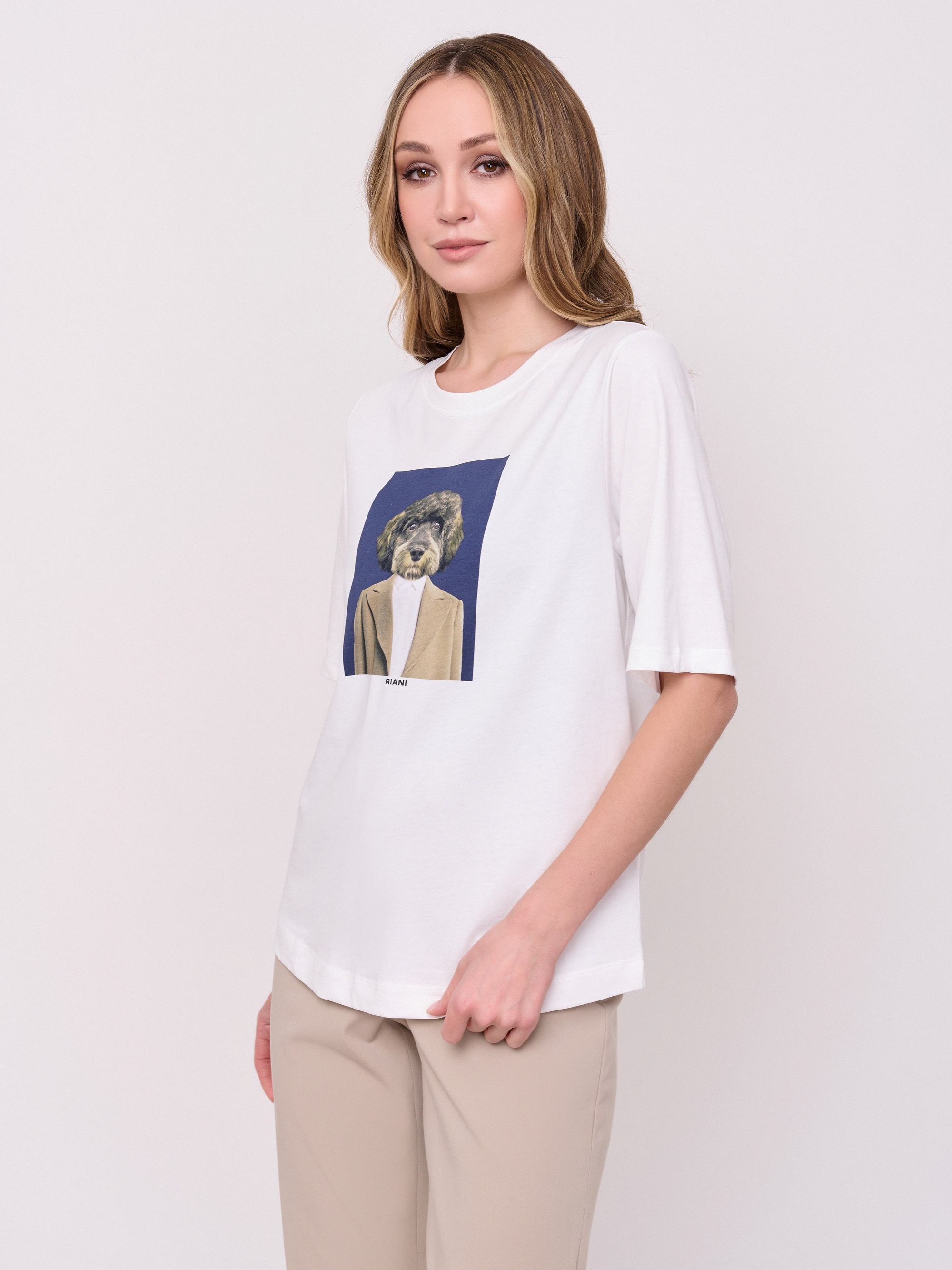 Детали: вырез горловины округлый, покрой прямой, рисунок принт, без надписи, боковые разрезы. Длина по спинке: 62 см.