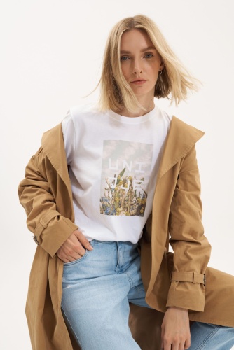 Белая футболка с размещенным принтом. Разноцветное фото кактуса с уникальным логотипом и нанесением страз. Немного укорочена. Короткий рукав. Длина: 62 см.