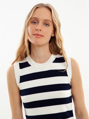 Вязаный кроп-топ в широкую полосу. Он станет универсальным дополнением для весенних casual-образов, с кардиганами, жакетами или рубашками.