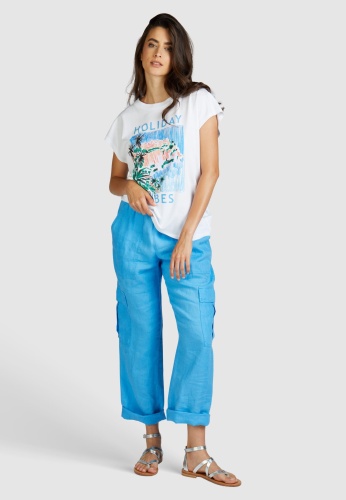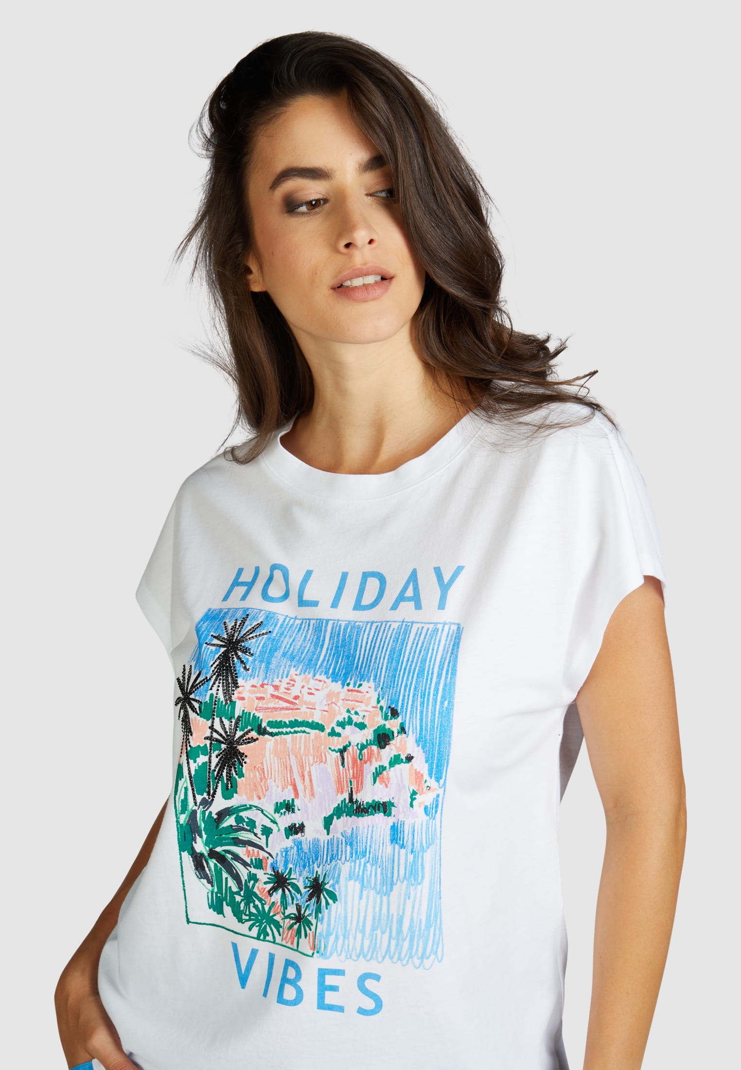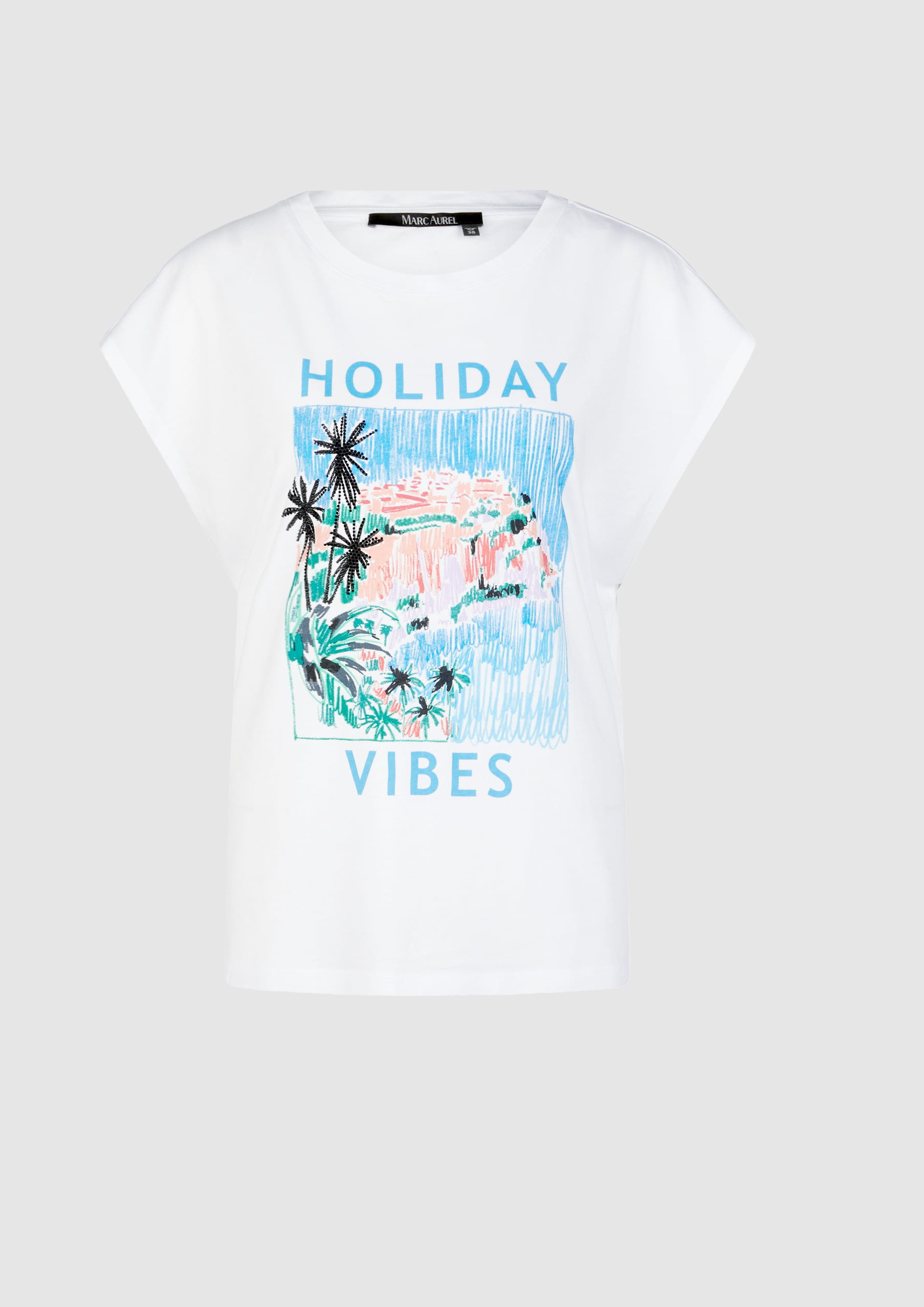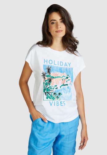 Комбинация хлопка и модала этой футболки с изысканным праздничным принтом обеспечивает максимальный комфорт. У него повседневный крой и классический круглый вырез. Модный вырез на плечах подчеркивает свободный стиль.