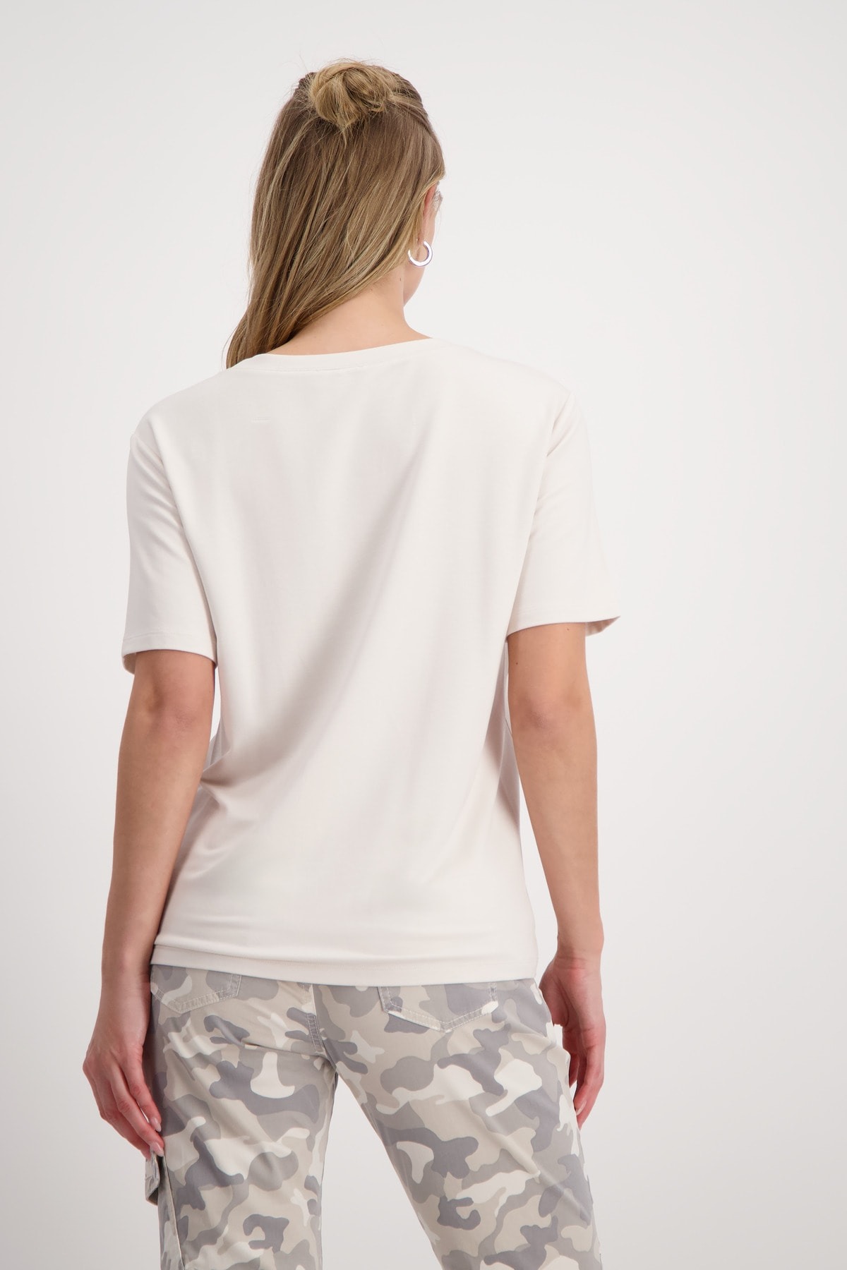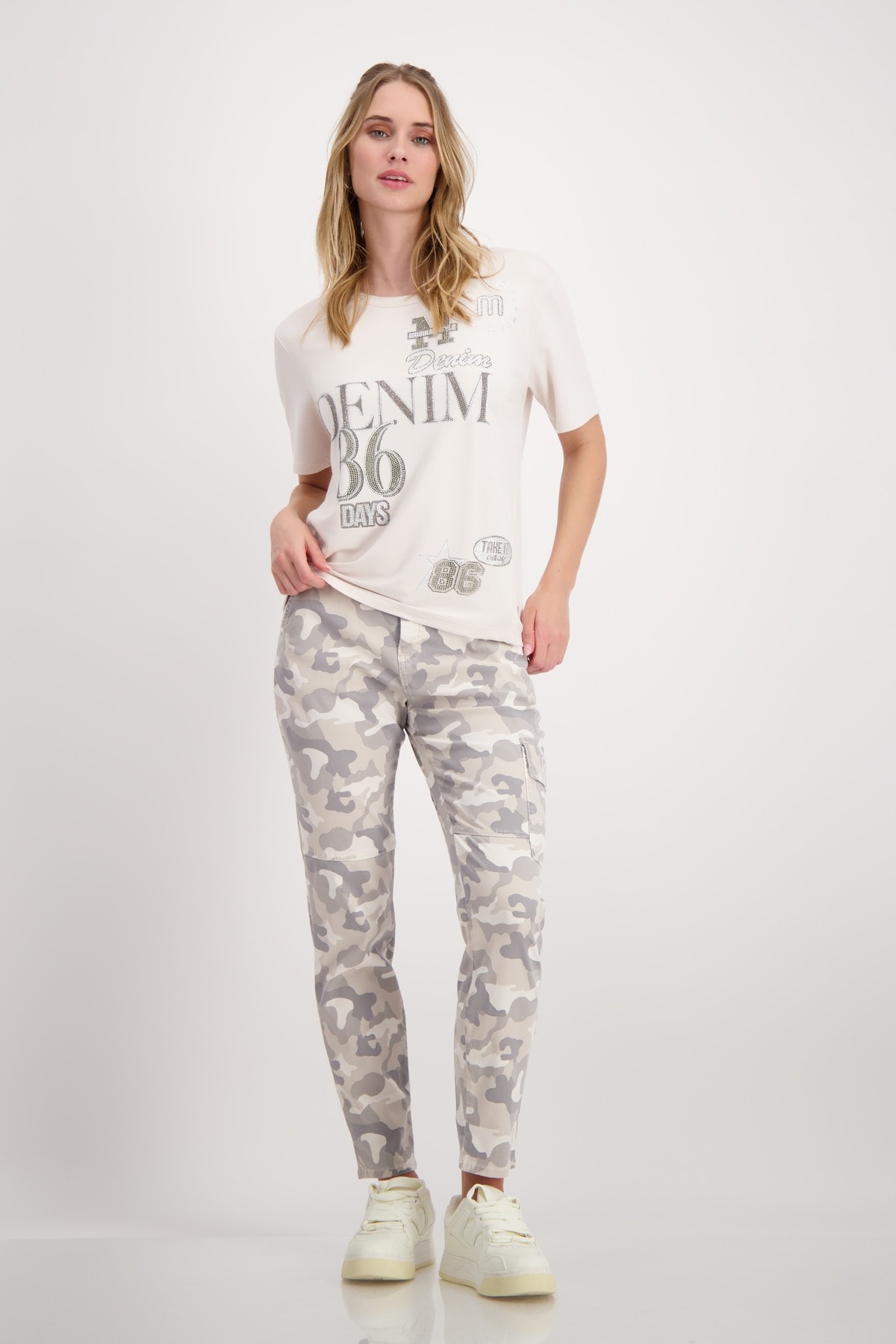 Стильная футболка из струящейся смесовой вискозы, украшенная сверкающими надписями из страз. Регулярная посадка. Круглый вырез. Короткие рукава слегка внахлест. Предварительный боковой шов. Удлиненная, закругленная спина. Длина спинки 44-го размера составляет 63 см, длина переда 60 см.