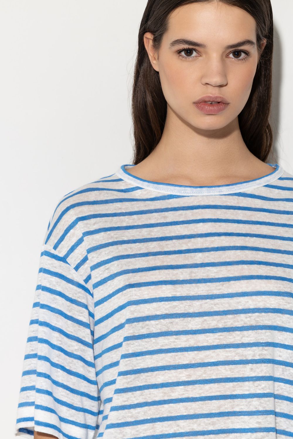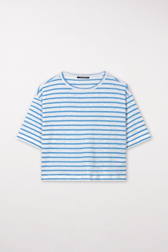 Футболка повседневного силуэта с короткими рукавами и круглым вырезом. Высококачественный льняной трикотаж украшен летним полосатым рисунком.