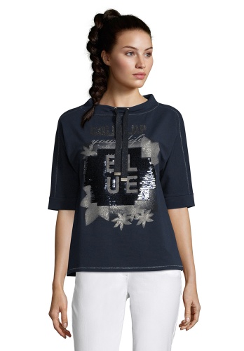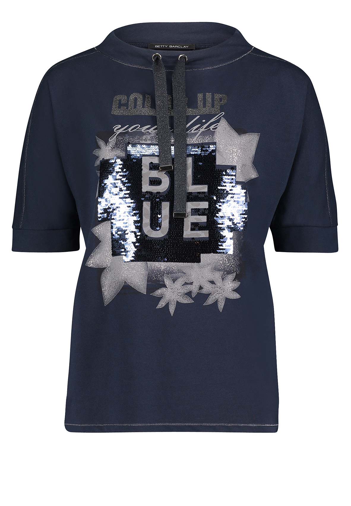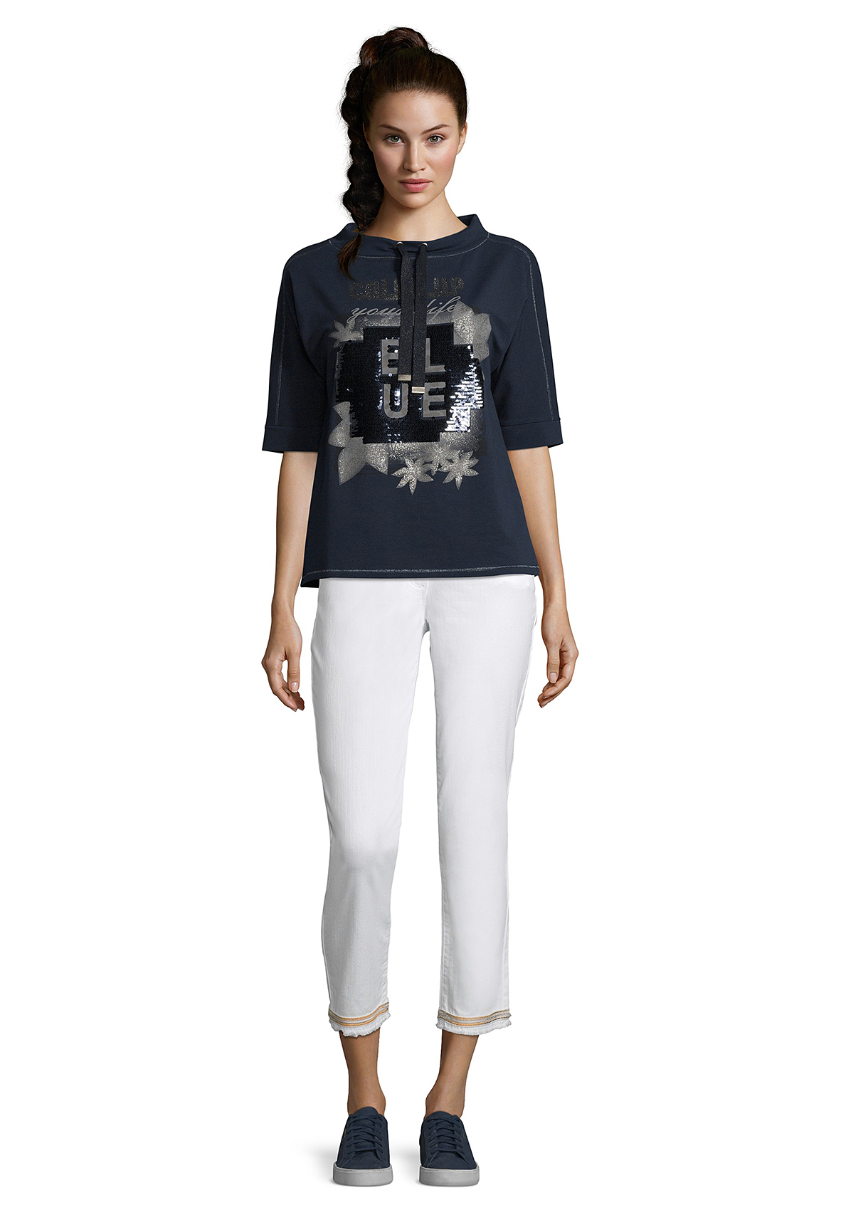 Футболка свободного покроя в стиле кэжуал. Широкая горловина с завязками, рукава 1/2 с подворотами. Металлизированный принт и декор пайетками придают образу демократичный вид. Декоративная отстрочка с нитью люрекса. Приятный к телу материал из смеси хлопка и модала. Эта модель создает непринужденный образ и великолепно подходит для прогулок и встреч с друзьями.