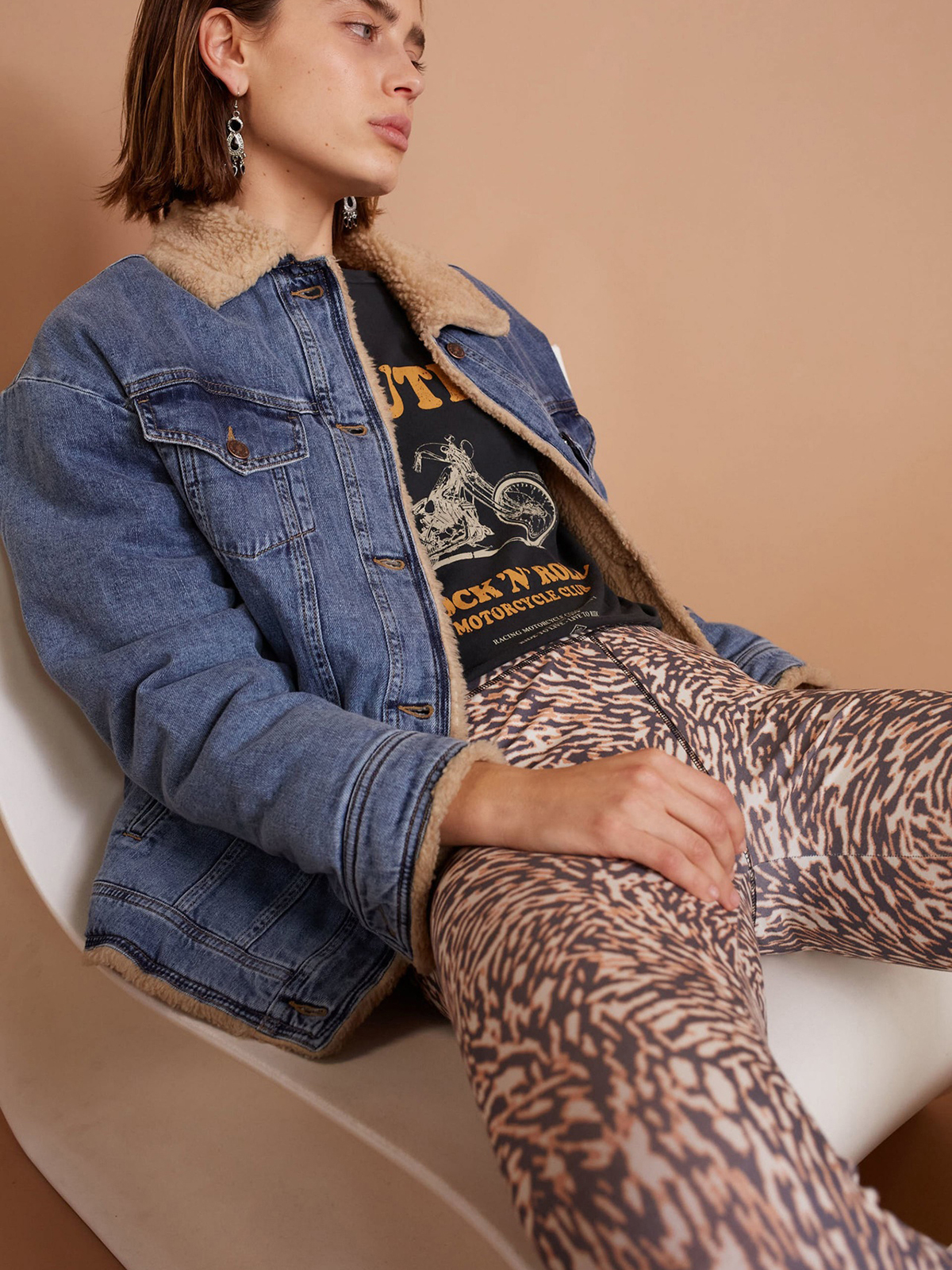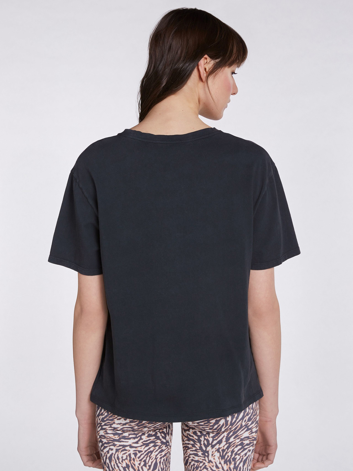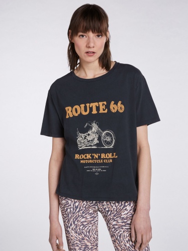 Черная футболка с принтом в винтажном стиле. Свободный силуэт подходит для любого типа фигуры. Широкий овальный вырез горловины оголяет шею, придает образу притягательную небрежность. Футболка идеально дополнит образ в стиле кэжуал или гранж.