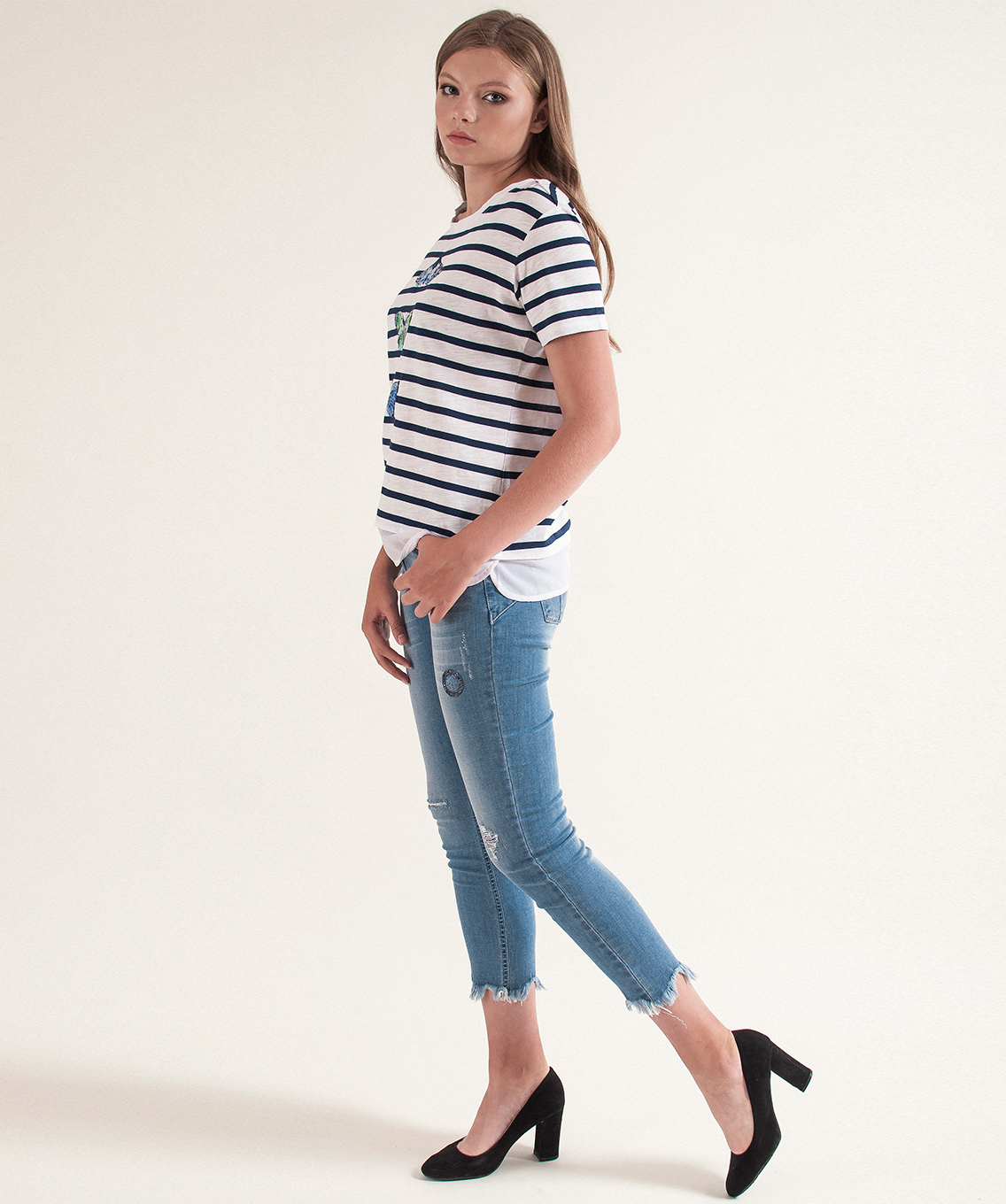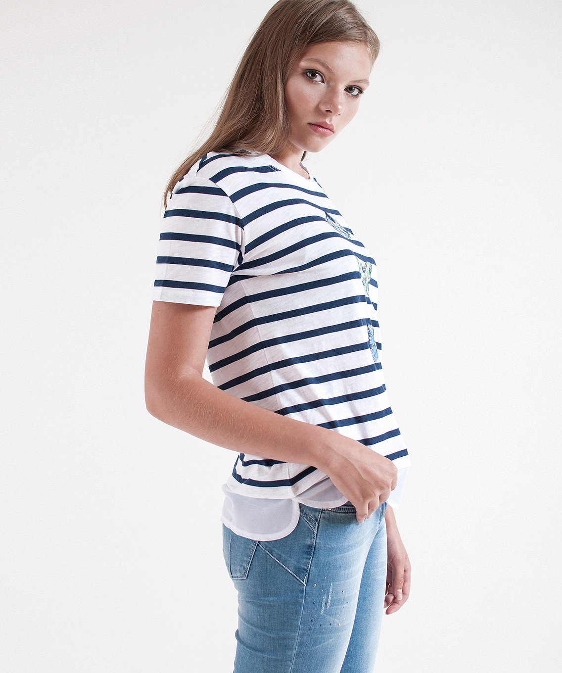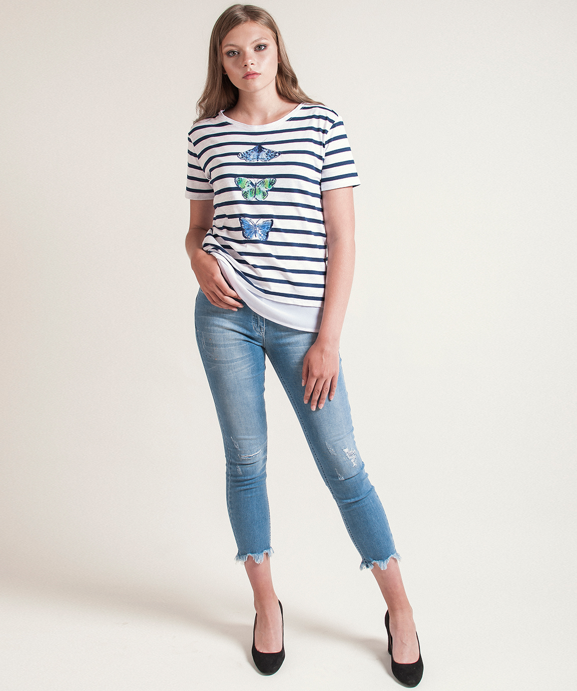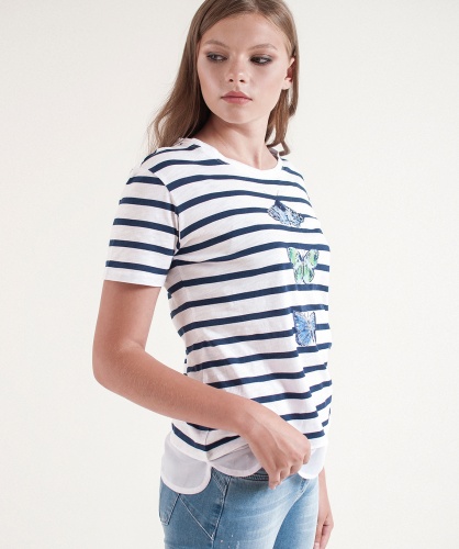 Футболка прямого покроя с имитацией модели-двойки. Горловина "лодочка". Принт с изображением бабочек, декор: пайетки.