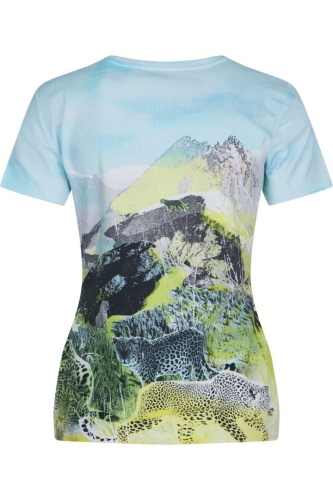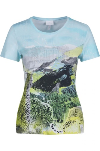 Футболку украшает яркий анималистичный принт по всей поверхности и тисненый принт на груди в сочетании со стразами. Фирменная эмблема на подоле. Короткий втачной рукав, овальный вырез горловины.