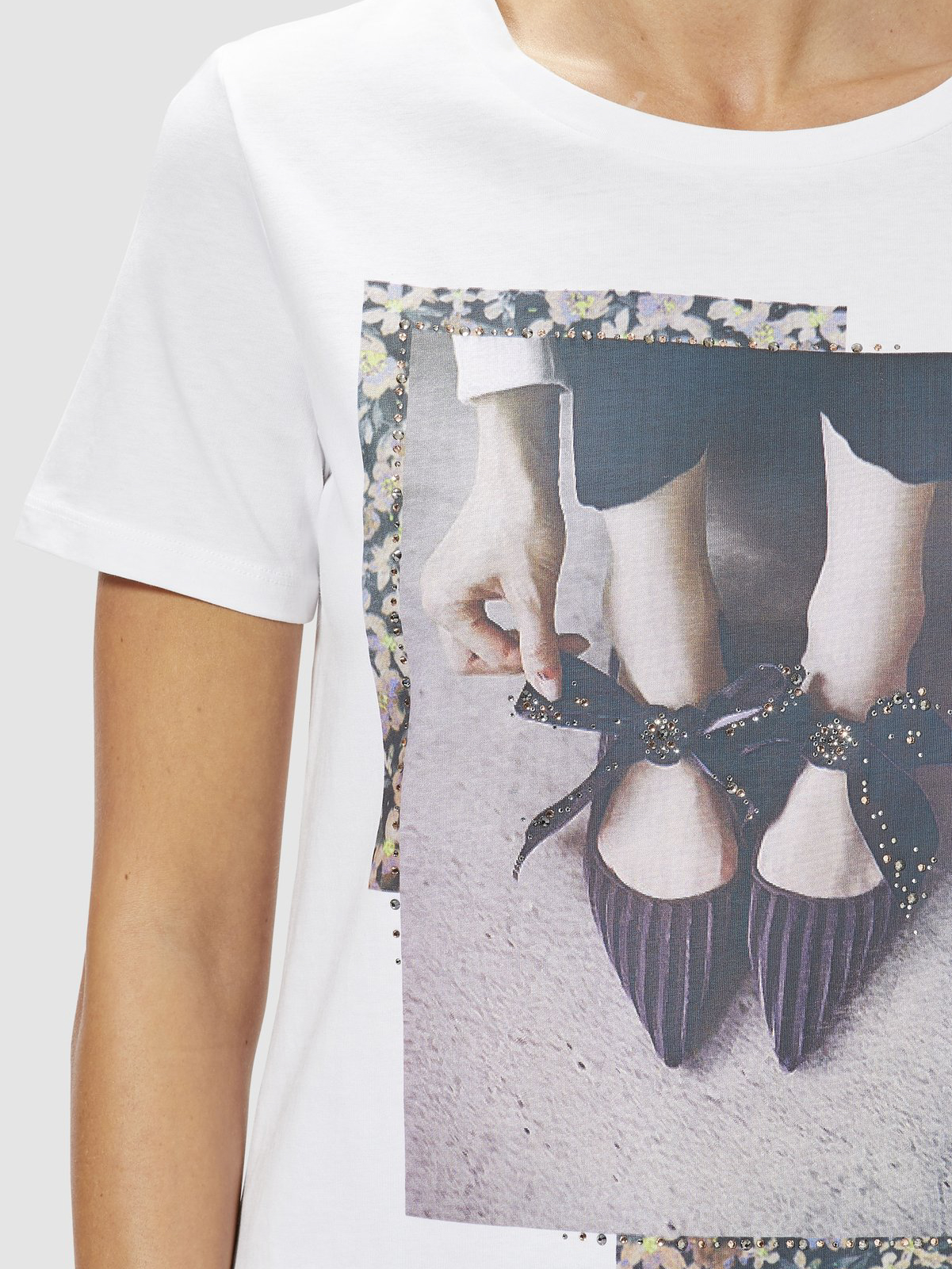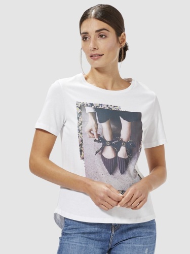 Белая хлопковая футболка с оригинальным принтом может выступать в качестве самостоятельного верха или надеваться под пиджак. Короткий втачной рукав, овальный врез горловины.