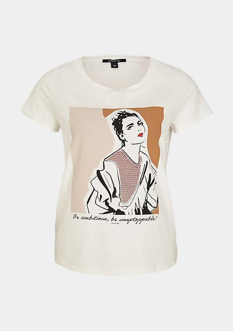 Однотонная футболка с принтом – необходимый элемент капсульного гардероба, отлично сочетается как с джинсами и брюками, так и с юбками, как самостоятельный верх или под пиджак. Круглый вырез горловины, короткий втачной рукав.