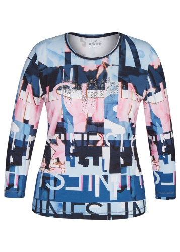 Футболка выполнена в ярком урбанистическом дизайне. Круглая горловина украшена черной эластичной лентой. Втачной рукав ¾.