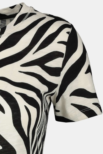 Футболка свободного силуэта в анималистичном принте – яркий элемент гардероба современной женщины. Круглая горловина, втачной короткий рукав. В сочетании с брюками или юбкой станет частью трендового образа.
