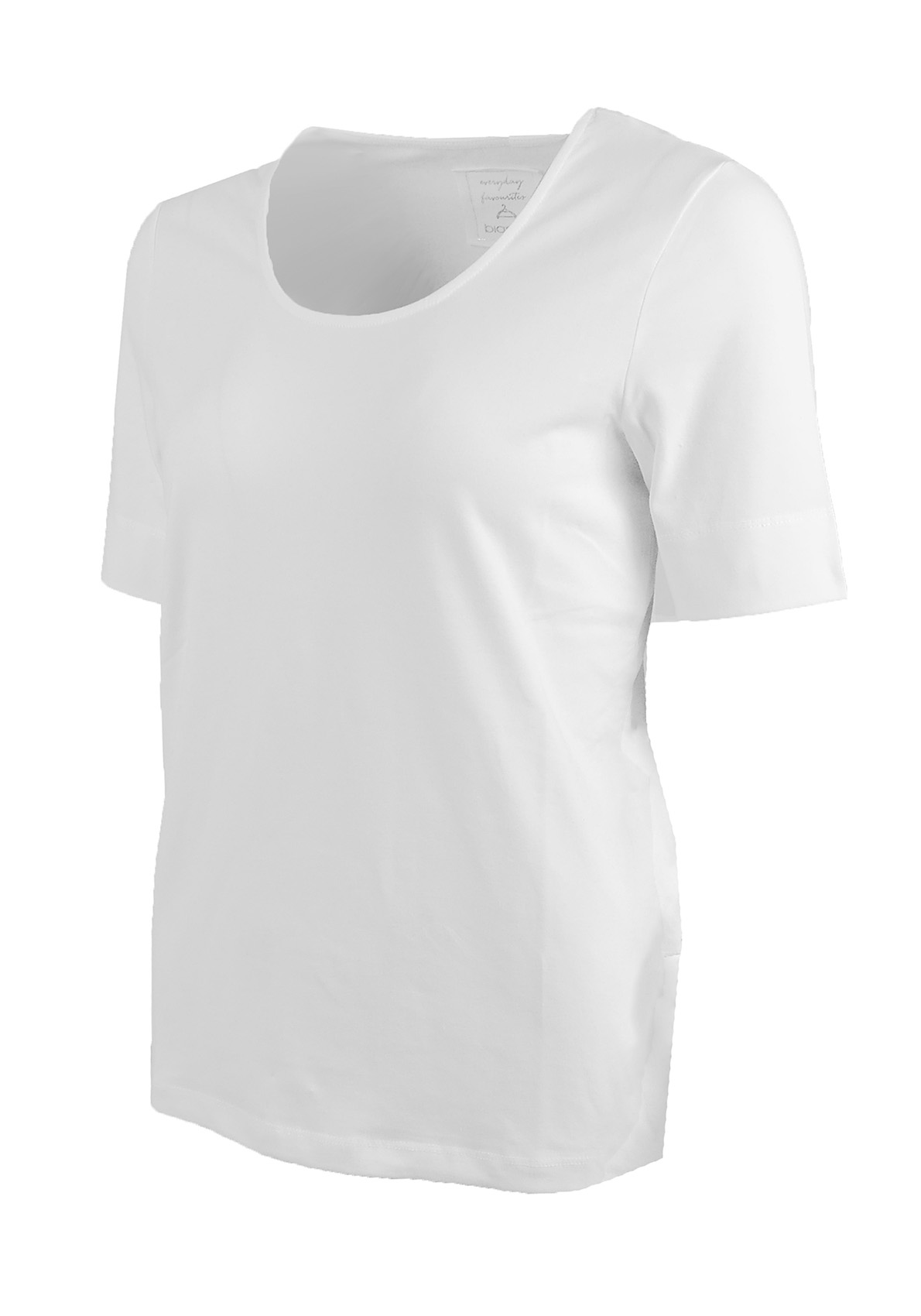 Эта классическая футболка с рукавом 1/2 и круглым вырезом горловины предоставляет широкий спектр возможных комбинаций. Данная модель сочетает в себе безупречный дизайн с удобным покроем. Высококачественная ткань из смеси хлопка и эластана обеспечивает комфорт в ношении и сохраняет форму даже после стирки! Благородную базовую футболку можно сочетать с легким кардиганом или элегантным блейзером.