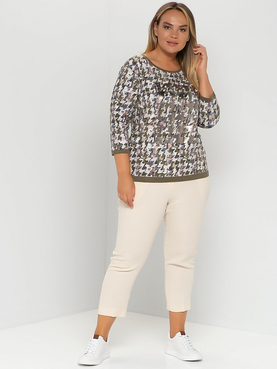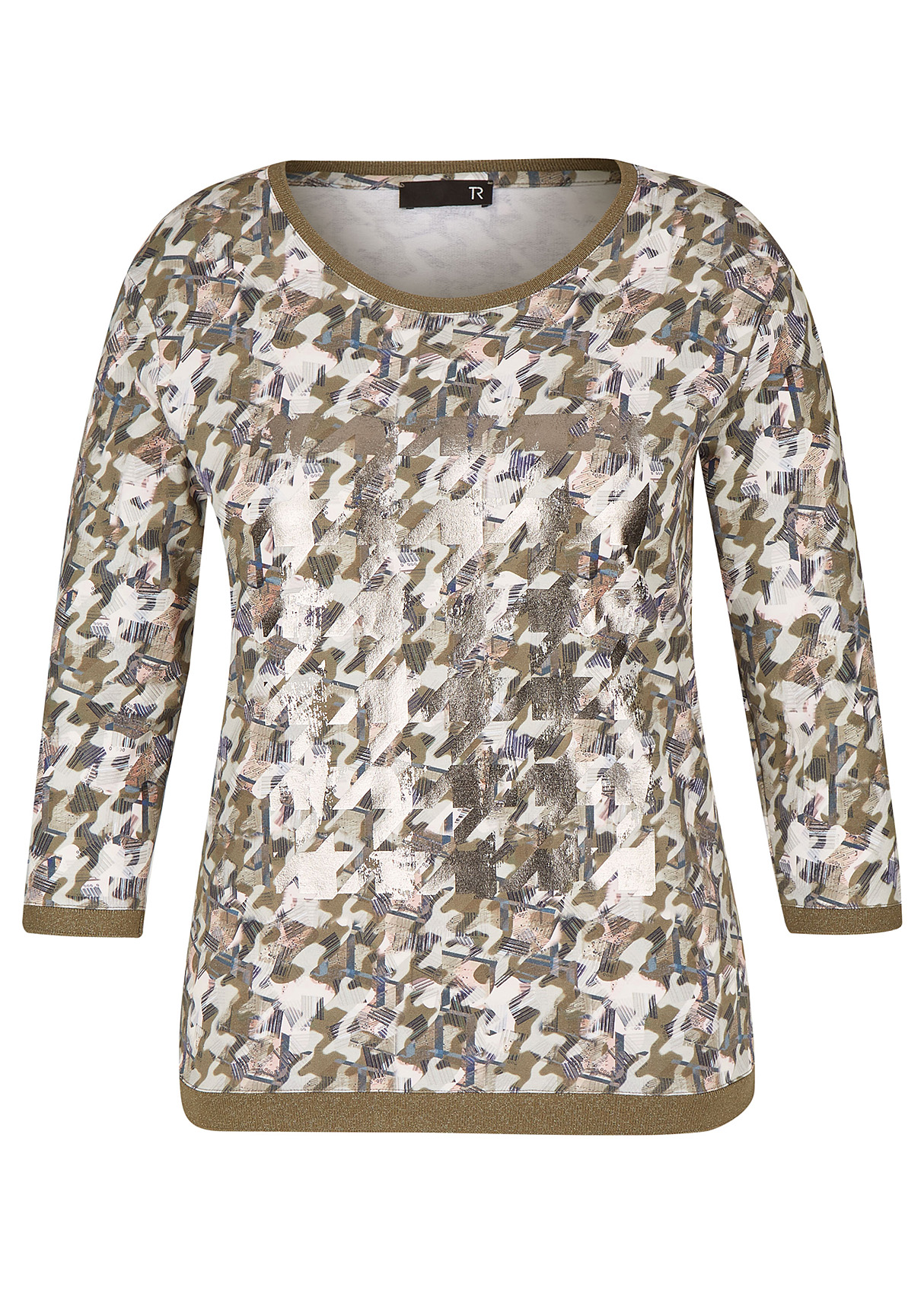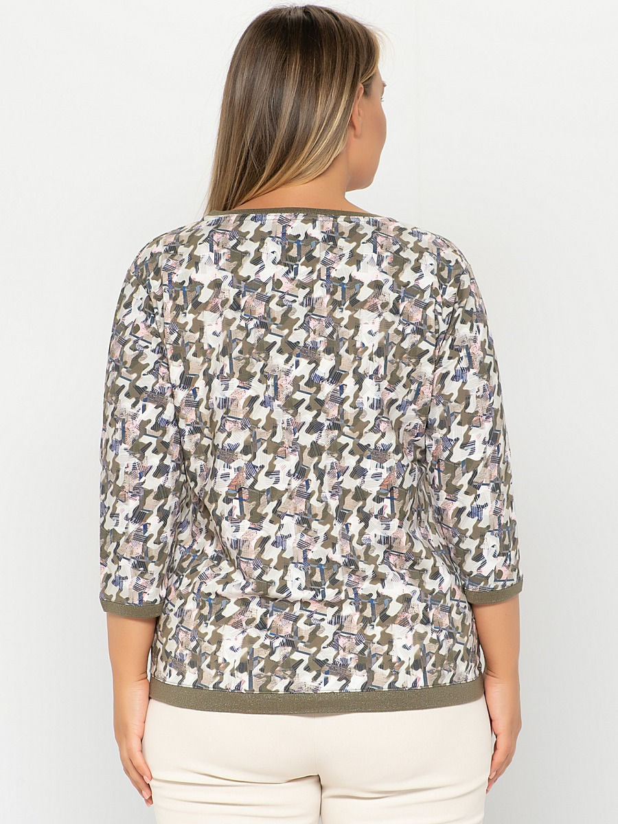 Эта футболка обращает на себя внимание благодаря необычному абстрактному принту. Слегка приталенный силуэт, круглый вырез горловины, втачные рукава 3/4. Отделка с нитью люрекса придает легкий блеск. Приятный к телу материал из хлопковой смеси обеспечивает комфорт.