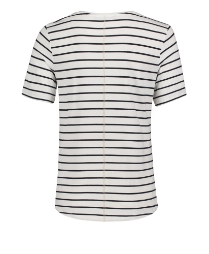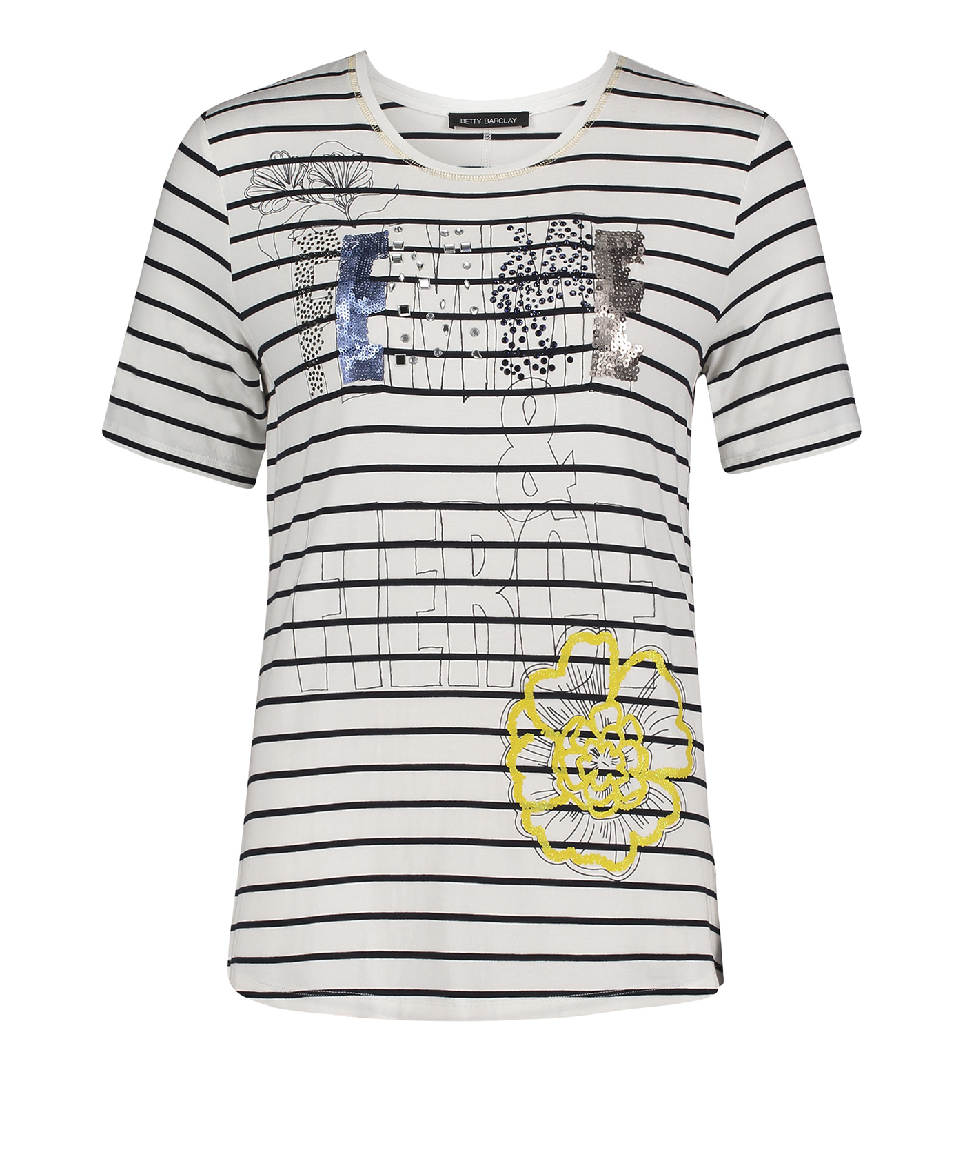 Полосатая футболка с принтом и пайетками - воплощение стиля кэжуал! Прямой покрой, круглый вырез горловины, рукава 1/2. Материал из вискозной смеси приятен к телу и обеспечивает комфорт. Эта футболка отлично дополняет образ с джинсами и кроссовками.
