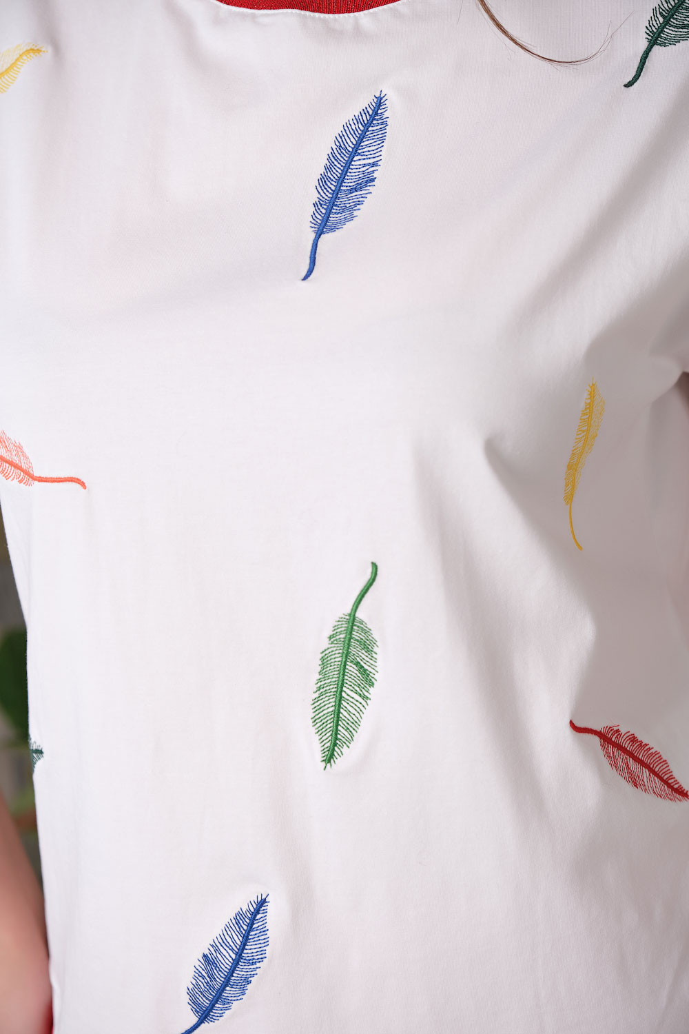 Ткань из натуральных материалов обеспечит комфорт и прохладу жарким летом. Круглый вырез горловины обработан декоративной обтачкой. Оригинальная вышивка в виде перьев создает воздушный образ, который усиливается за счет свободного покроя изделия и рукава "летучая мышь". Данная модель демократична по стилю и будет хорошо сочетаться с брюками.