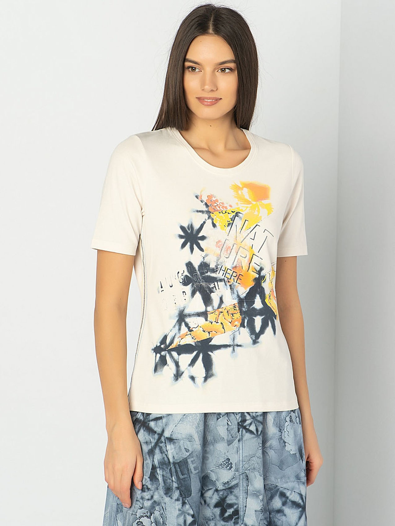 Футболка слегка приталенного силуэта. Трендовый принт с эффектом батика, пайетки. Приятный к телу материал из смеси хлопка и эластана. Длина изделия по спинке: 65 см.