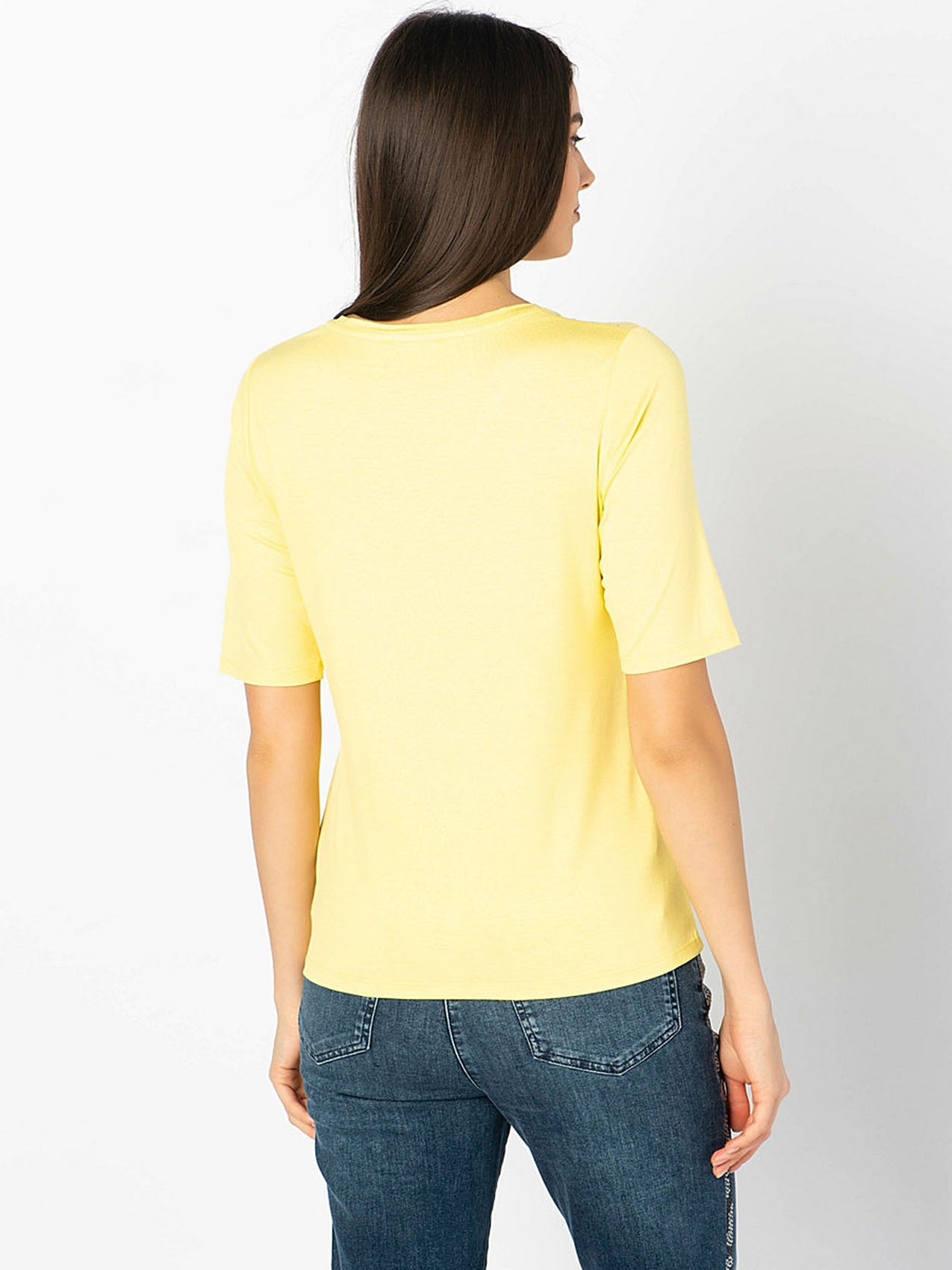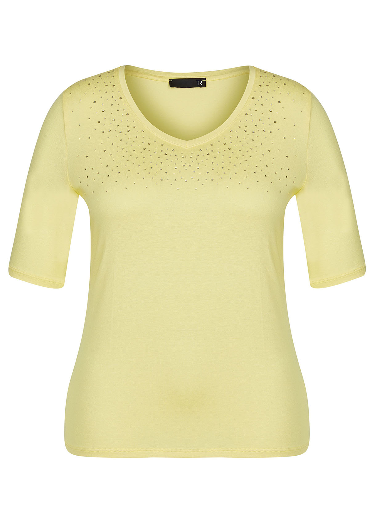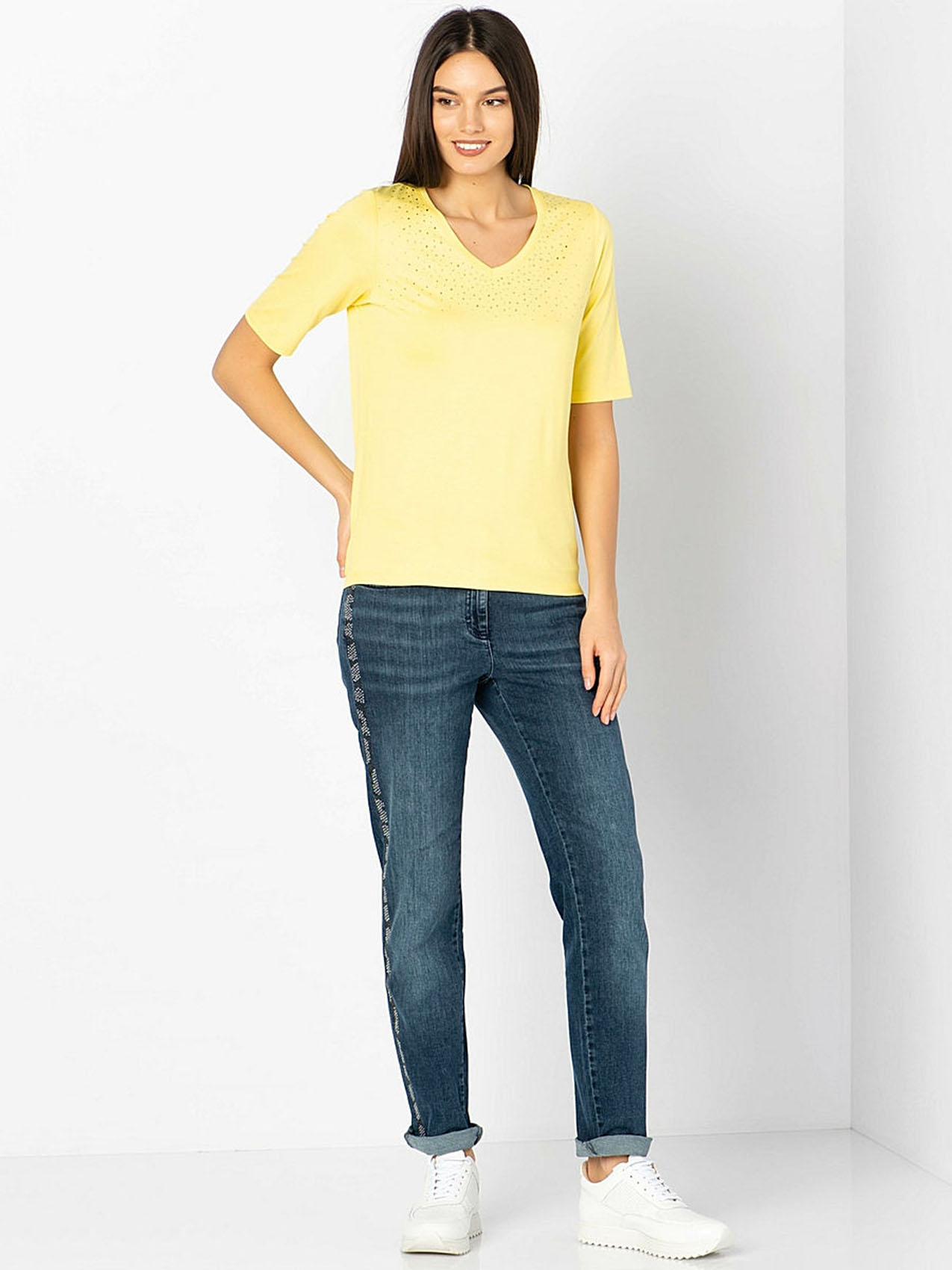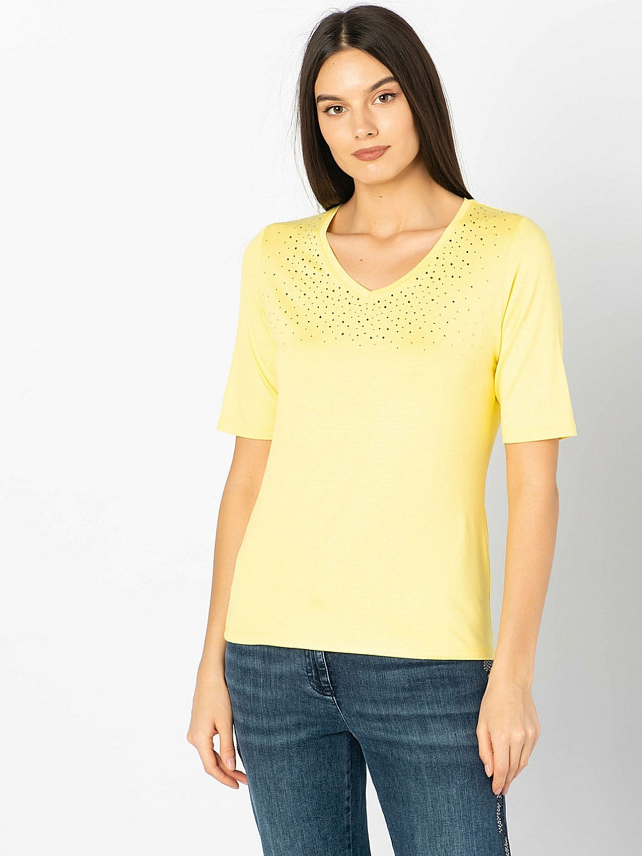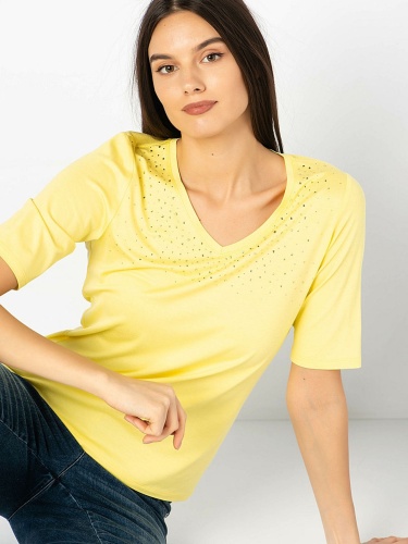 • слегка приталенный покрой • V-образный вырез • рукав 1/2 • трендовый желтый цвет • декор: стразы • приятный к телу материал из смеси вискозы и эластана