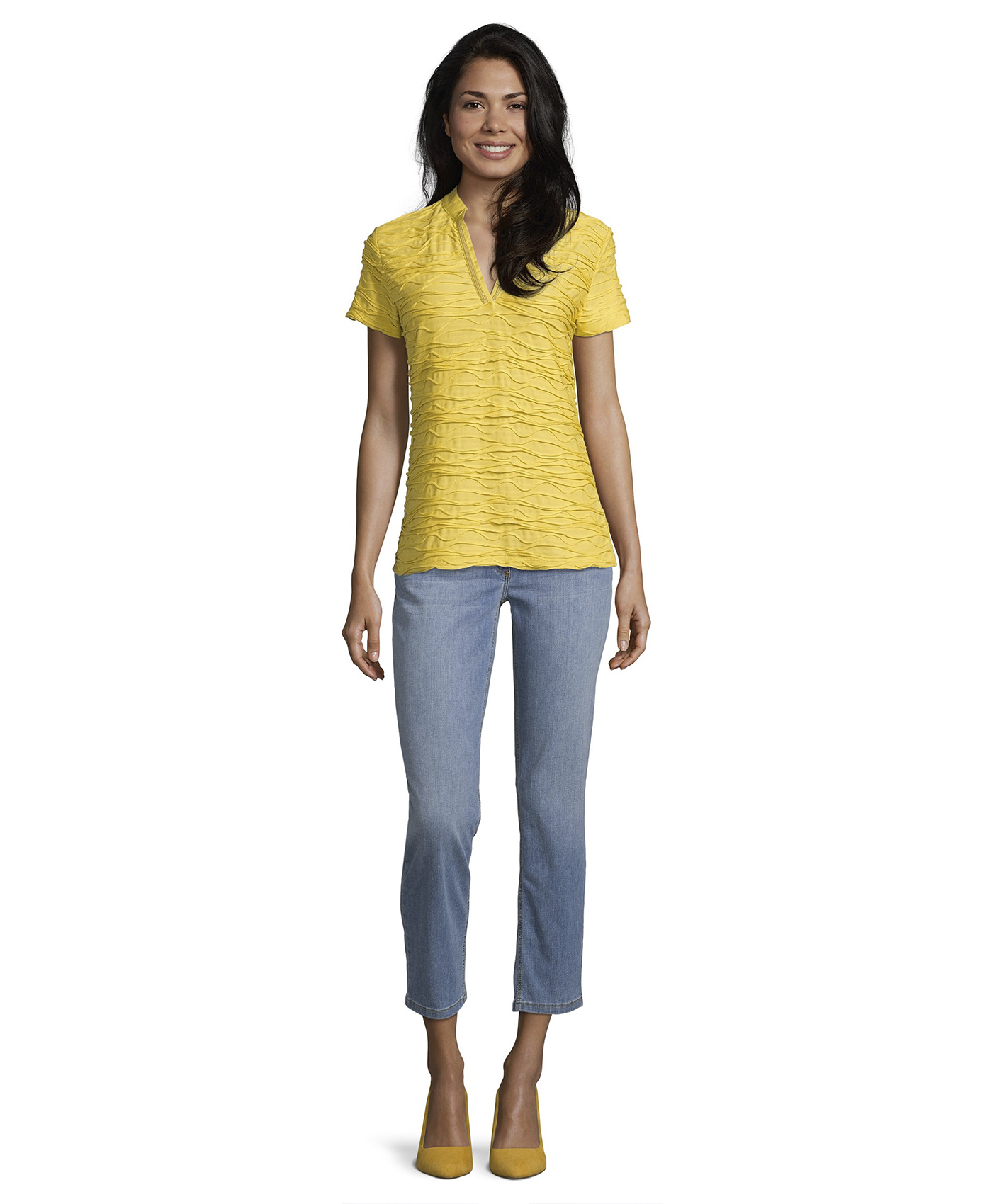 Однотонная футболка прямого покроя - абсолютно необходимая вещь в гардеробе. Короткие рукава, V-образный вырез горловины с отделкой тесьмой. Интересная фактура ткани привлекает внимание. Футболка отлично сочетается как с брюками, так и с юбкой.