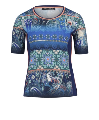 Футболка приталенного силуэта подчеркивает достоинства фигуры. Круглый вырез горловины, рукава 1/2. Материал из хлопковой смеси обеспечивает комфорт. Этнический принт и красивое сочетание контрастных цветов непременно обратят на себя внимание. Эта яркая вещь освежит любой комплект одежды!