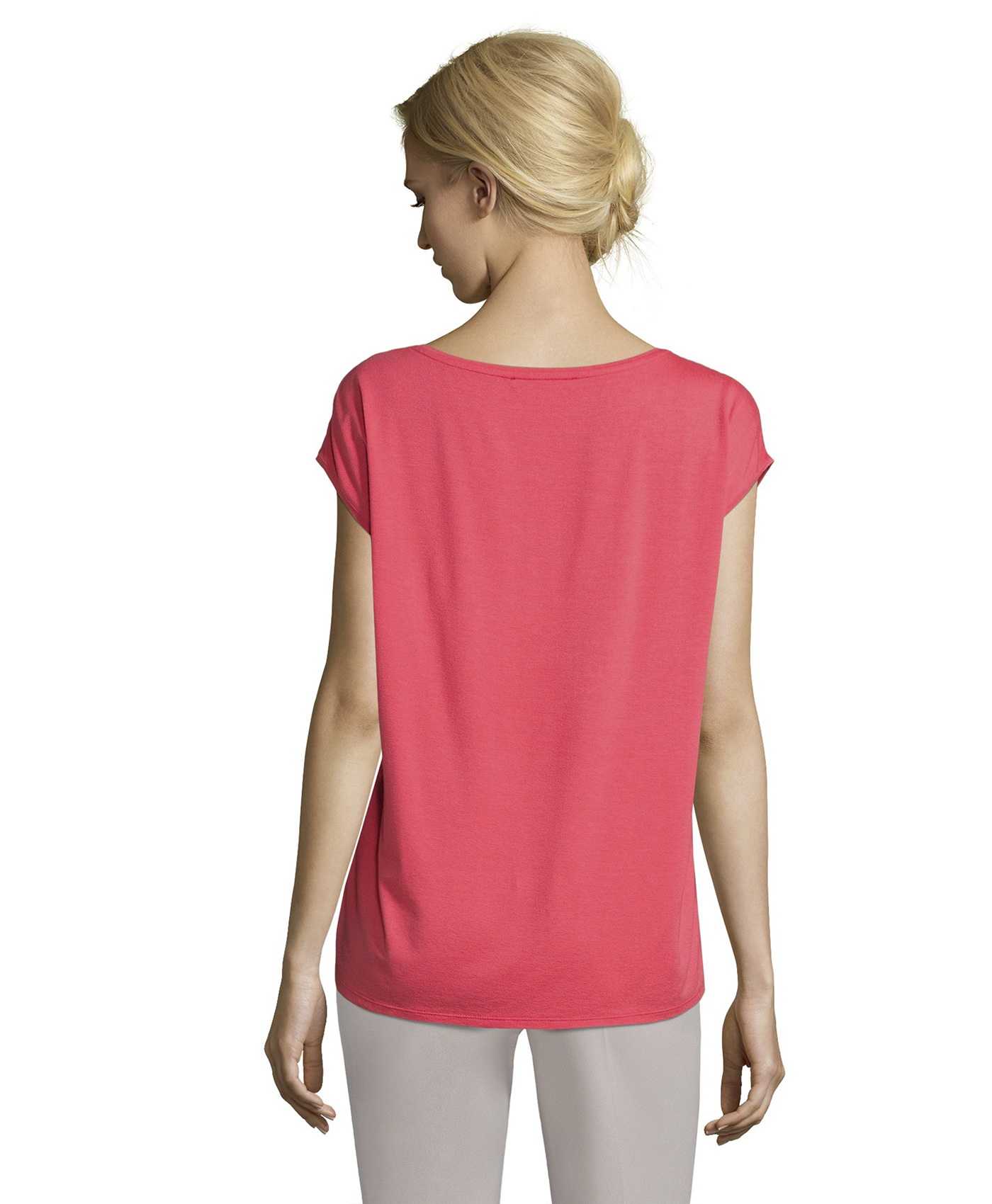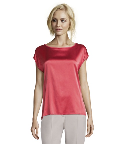 Однотонная футболка - обязательная модель любого гардероба! Прямой покрой, вырез горловины "лодочка", короткие цельнокроеные рукава. Благородный материал из смеси шелка приятен к телу. Атласный блеск передней части изделия контрастирует с матовым материалом спинки. Эта универсальная футболка смотрится очень элегантно и станет изюминкой вашего делового образа.