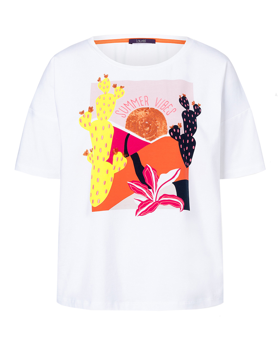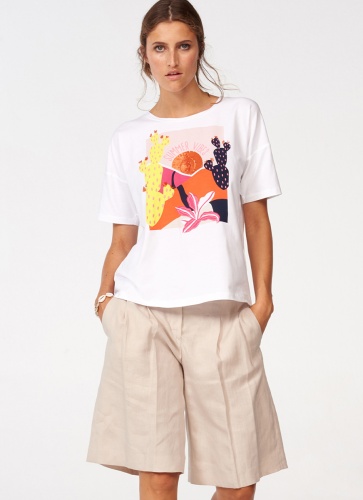 Яркий принт этой футболки непременно привлечет внимание! Футболка свободного силуэта. Круглый вырез горловины, короткие рукава со спущенным плечом. Приятный к телу материал из хлопковой смеси.