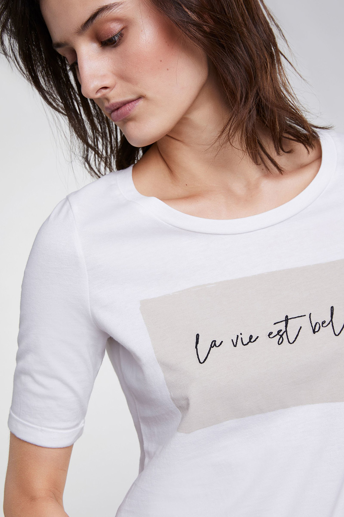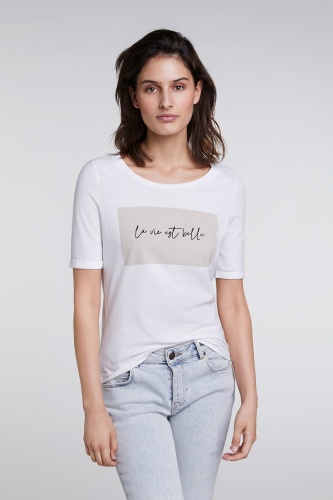 Эта футболка лаконична и элегантна в своем дизайне. Приталенный крой подчеркивает достоинства фигуры. Круглый вырез горловины, короткие рукава с фиксированными манжетами. Стильный акцент - принт с вдохновляющей надписью. Хлопковый материал приятен к телу и обеспечивает комфорт. Эта модель - прекрасный компаньон для образа как с брюками, так и с юбкой.