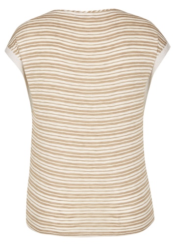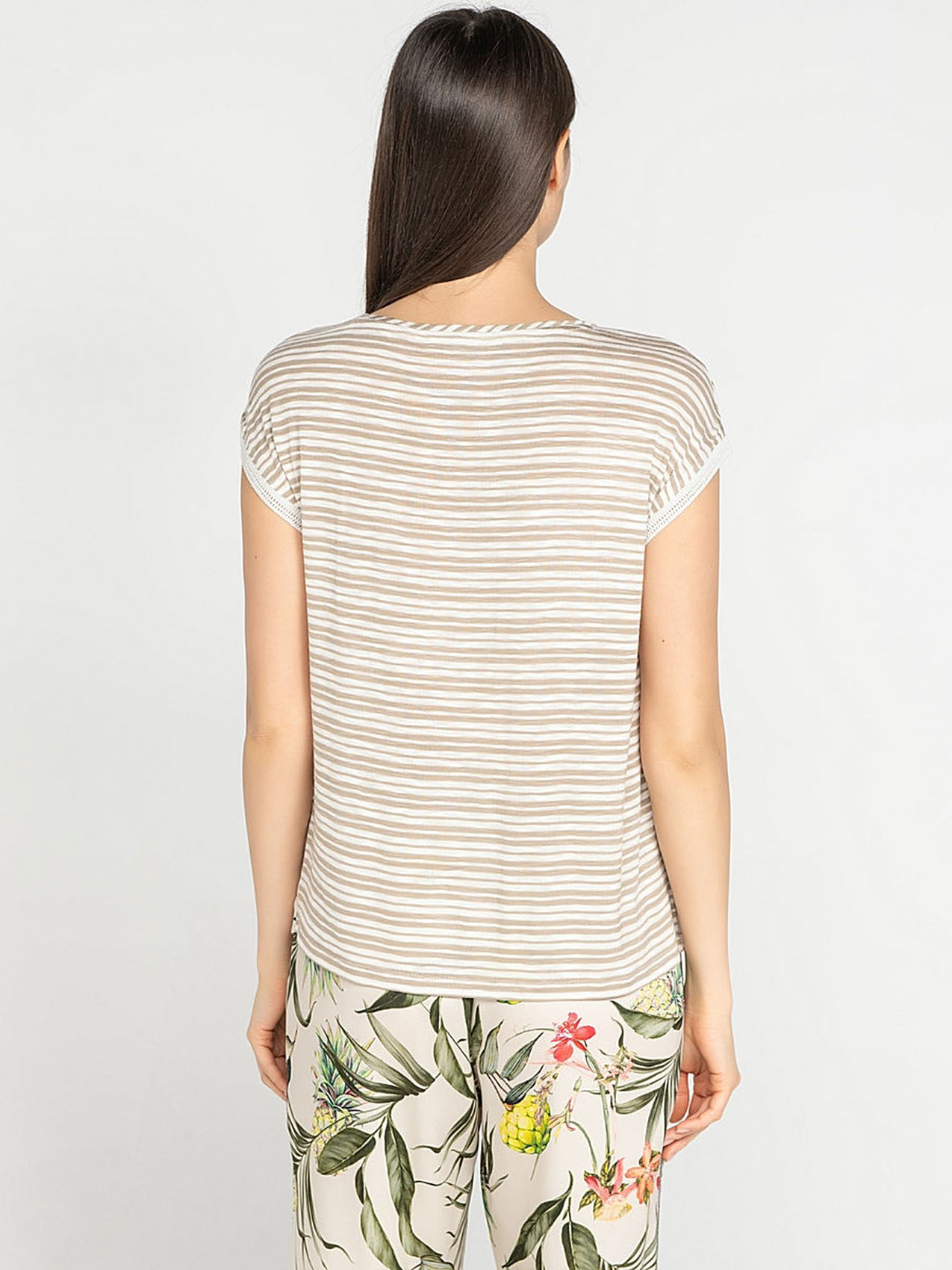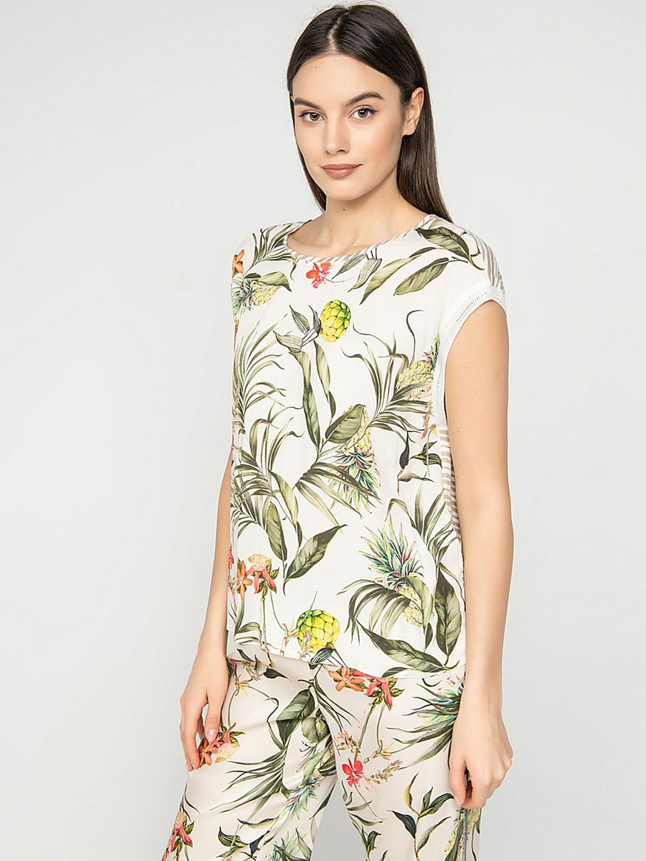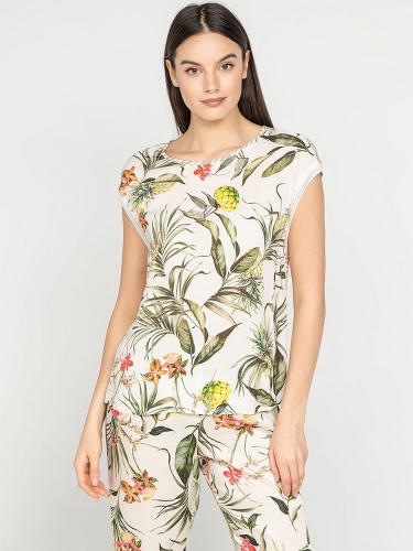 Удачное сочетание трендов - тропический принт спереди и полоска на спинке футболки. Прямой покрой, короткие цельнокроеные рукава. Приятный к телу материал из смеси вискозы и эластана. Отличный выбор для весенне-летнего сезона!