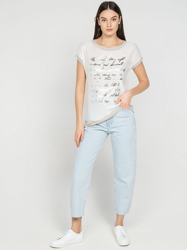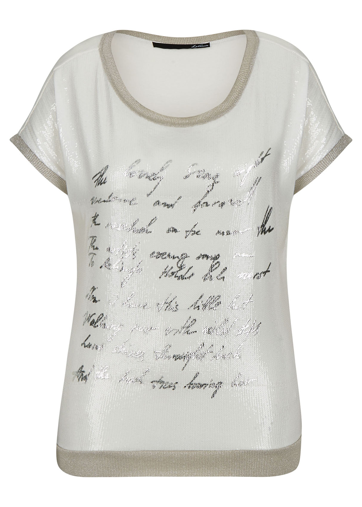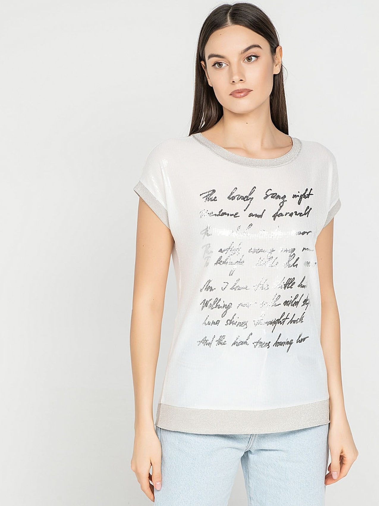 Элегантная футболка из ткани с пайетками. Слегка приталенный силуэт. Короткие цельнокроеные рукава. Приятный к телу материал из смеси вискозы и эластана.