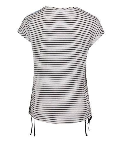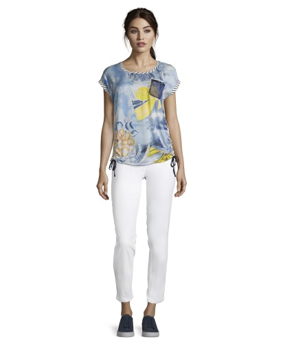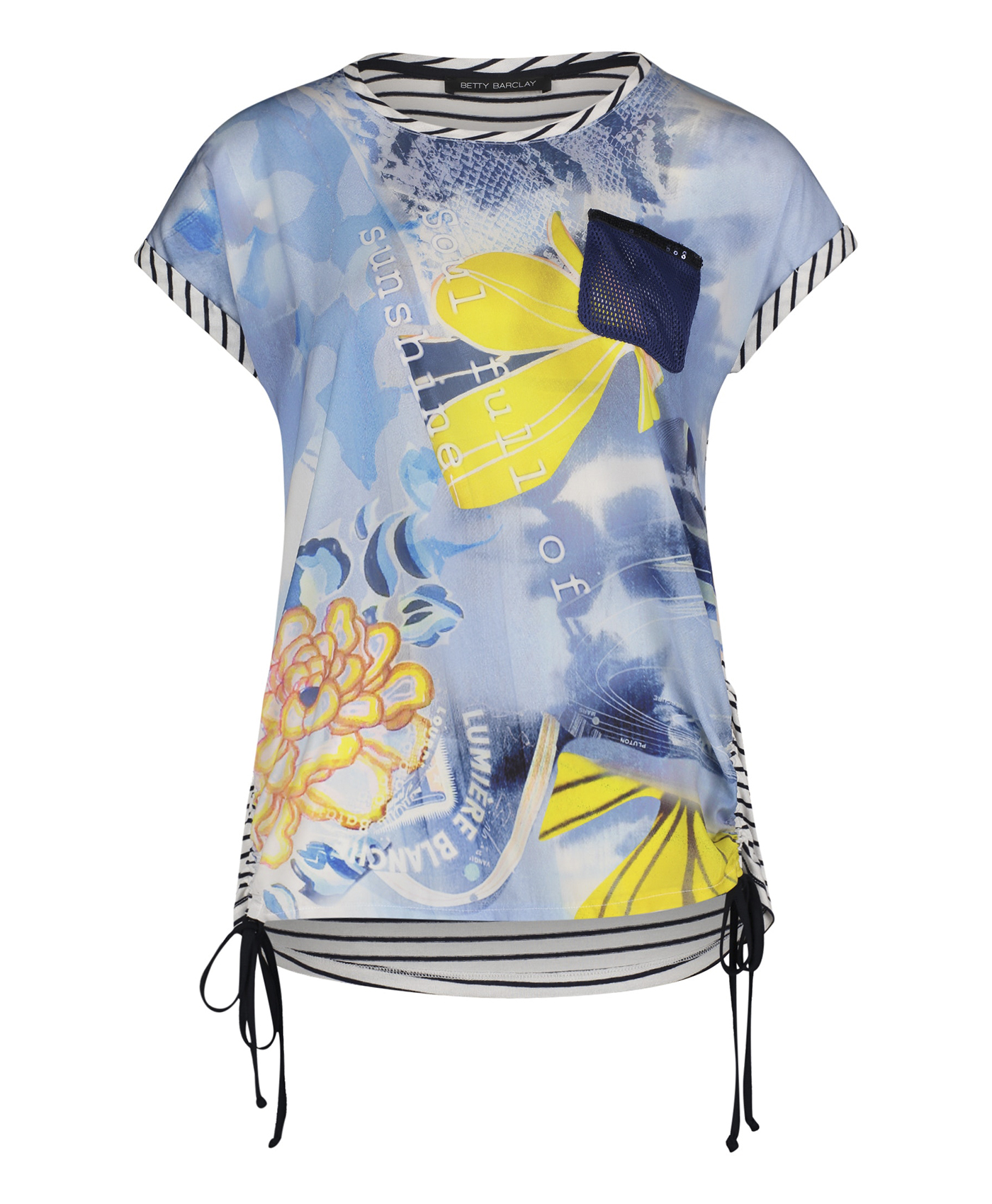 Топ прямого покроя. Круглый вырез горловины с обтачкой, короткие цельнокроеные рукава с фиксированными манжетами. Сочетание принтов и фактур непременно обратит на себя внимание. Абстрактный принт на переде изделия, принт в полоску - на спинке. Кулиски по бокам, декоративный карман на груди. Материал из вискозной смеси приятен к телу и обеспечивает комфорт. Эта женственная модель прекрасно смотрится с любым лаконичным вариантом низа.