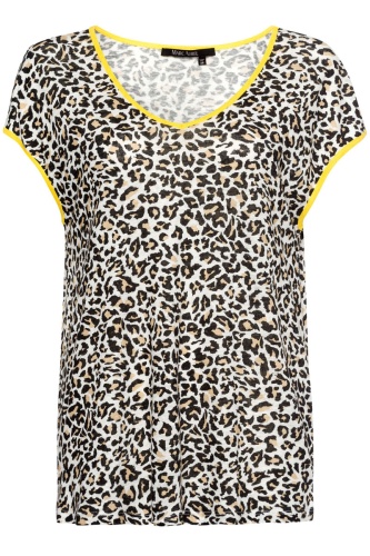 Футболка в трендовом принте. Свободный крой, V-образный вырез горловины, короткие цельнокроеные рукава. Контрастная отделка на горловине и рукавах. Льняной материал приятен к телу и обеспечивает комфорт.