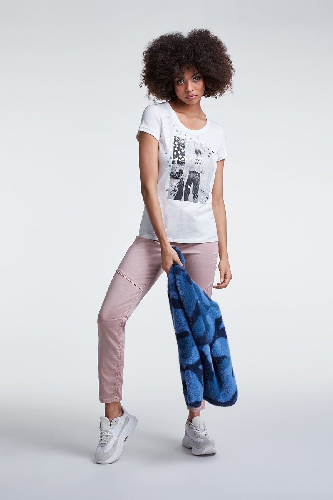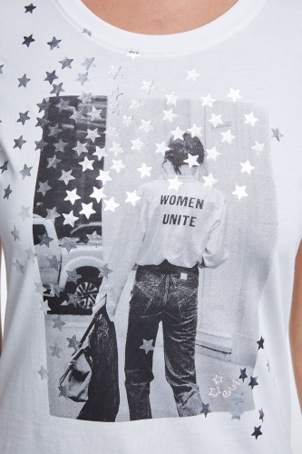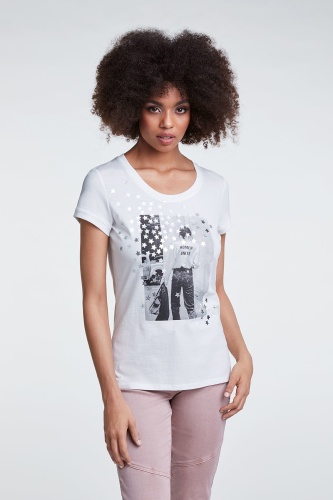 Стильная футболка полуприталенного силуэта. Круглый вырез горловины, короткие втачные рукава, принт с металлизированными элементами в виде звезд. Приятный к телу хлопковый материал обеспечивает комфорт.