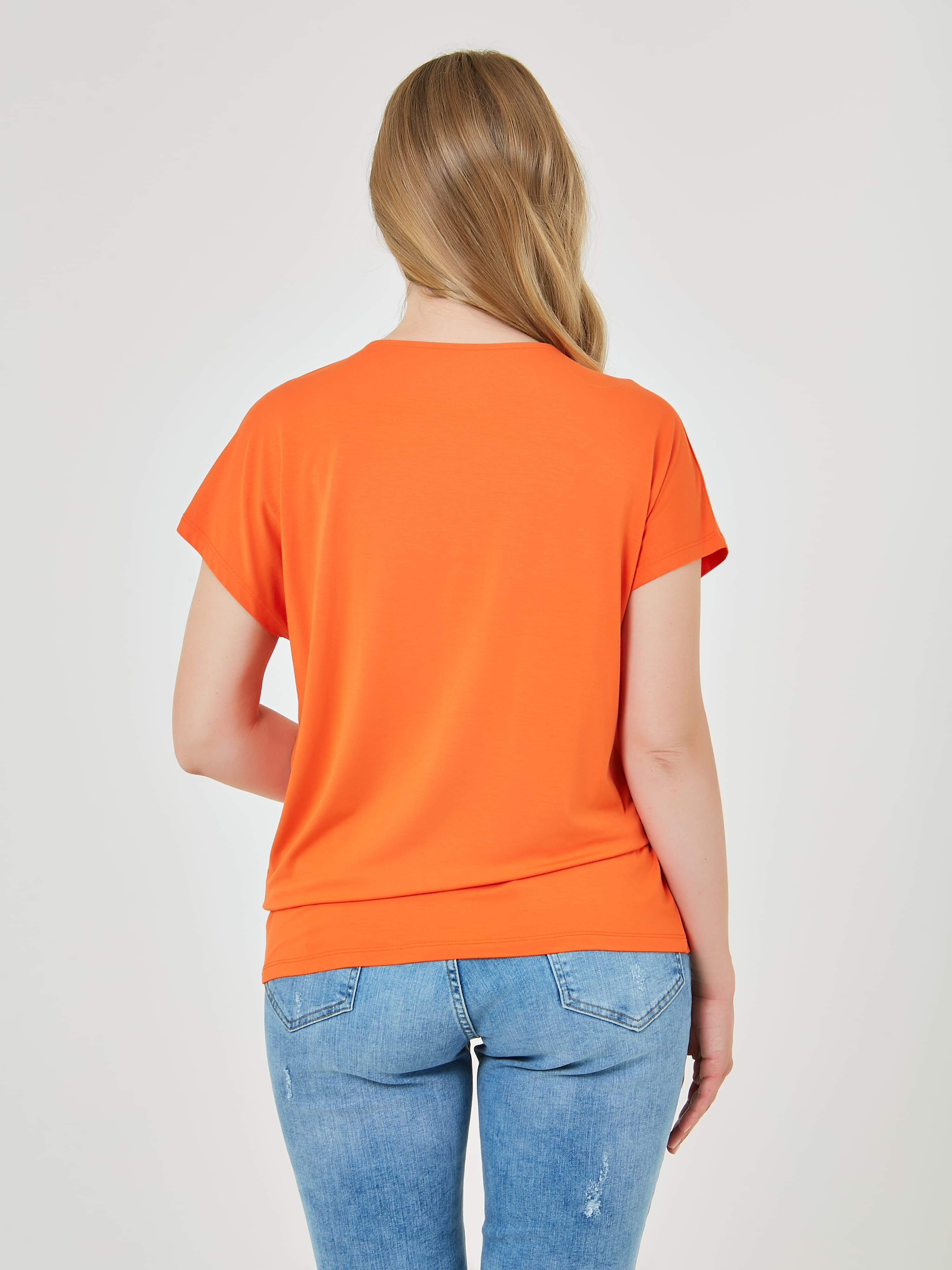 Яркая футболка с V-образным блестящим вырезом и свободным кроем. Коллекция Весна-Лето 2025. Капсула "Санторини". Параметры модели: 89-70-92, рост 167, размер 44-46