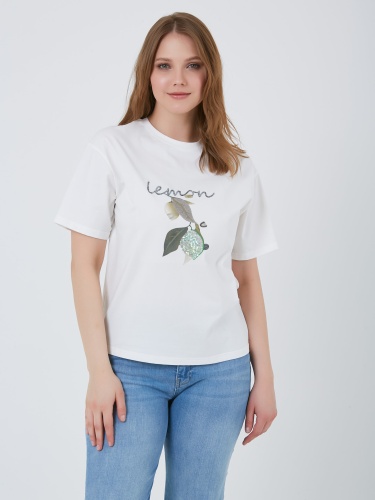 Футболка выполнена в белом цвете и украшена ярким принтом с изображением лимона. Модель имеет классический крой с круглым вырезом, что делает её подходящей для повседневной носки. Коллекция Весна-Лето 2025. Капсула "Рио де Жанейро". Параметры модели: 95-64-101, рост 175, размер 44-46