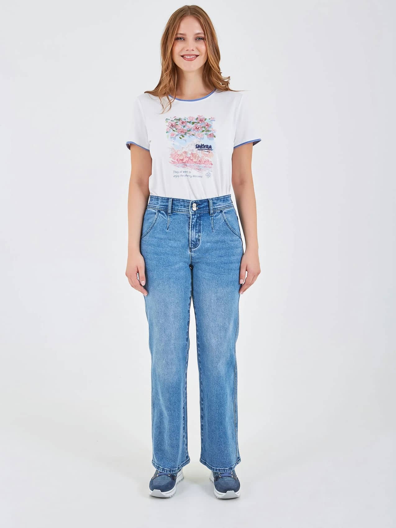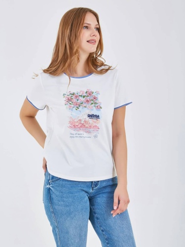 Футболка белого цвета с нежным цветочным принтом и изображением гор. Контрастные рукава и воротник голубого оттенка добавляют стильный акцент, идеально подходящий для повседневной носки. Коллекция Весна-Лето 2025. Капсула "Самарканд". Параметры модели: 95-64-101, рост 175, размер 44-46