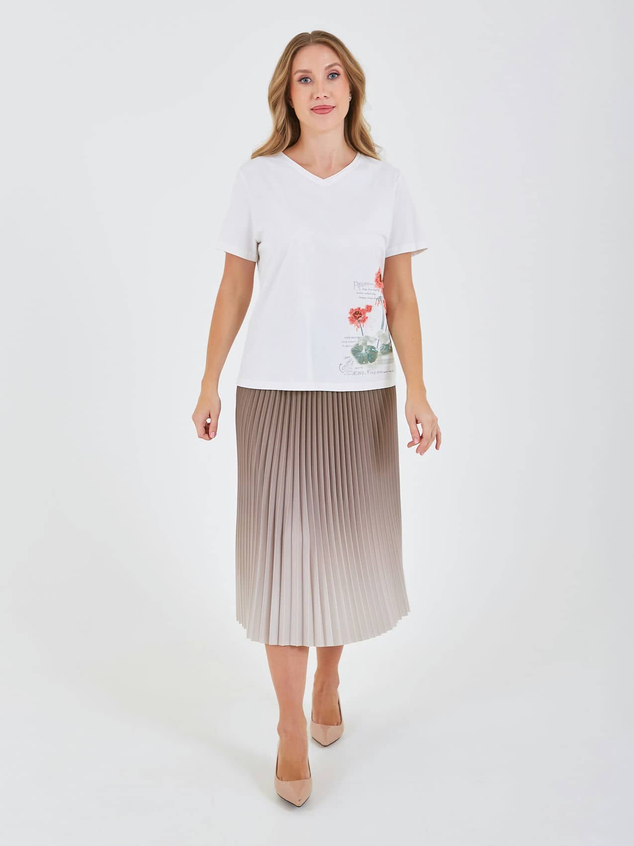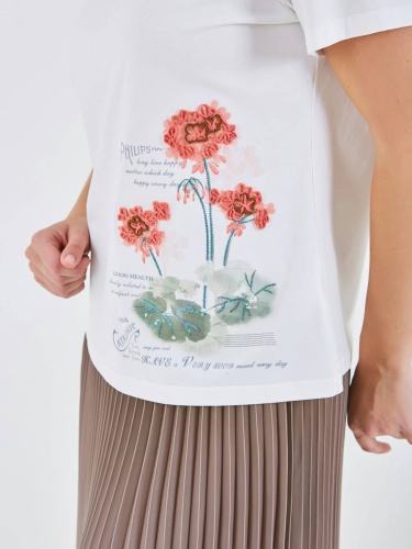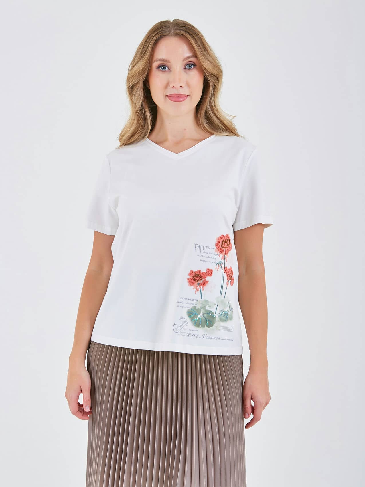 Футболка белого цвета с ярким принтом, на котором изображены цветы с надписями. Ненавязчивый текст на принте и V-образный вырез придают изделию стильный и женственный вид, идеально подходящий для повседневной носки. Коллекция Весна-Лето 2025. Капсула "Рио де Жанейро". Параметры модели: 89-70-92, рост 167, размер 44-46