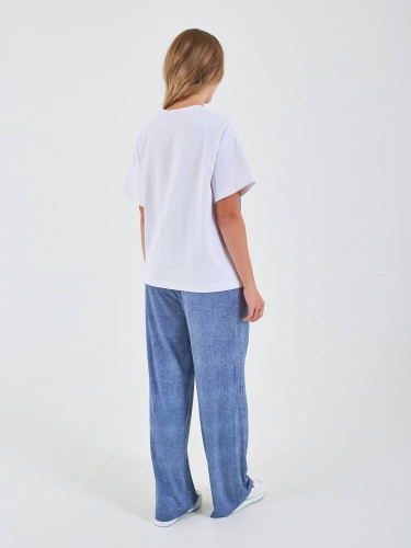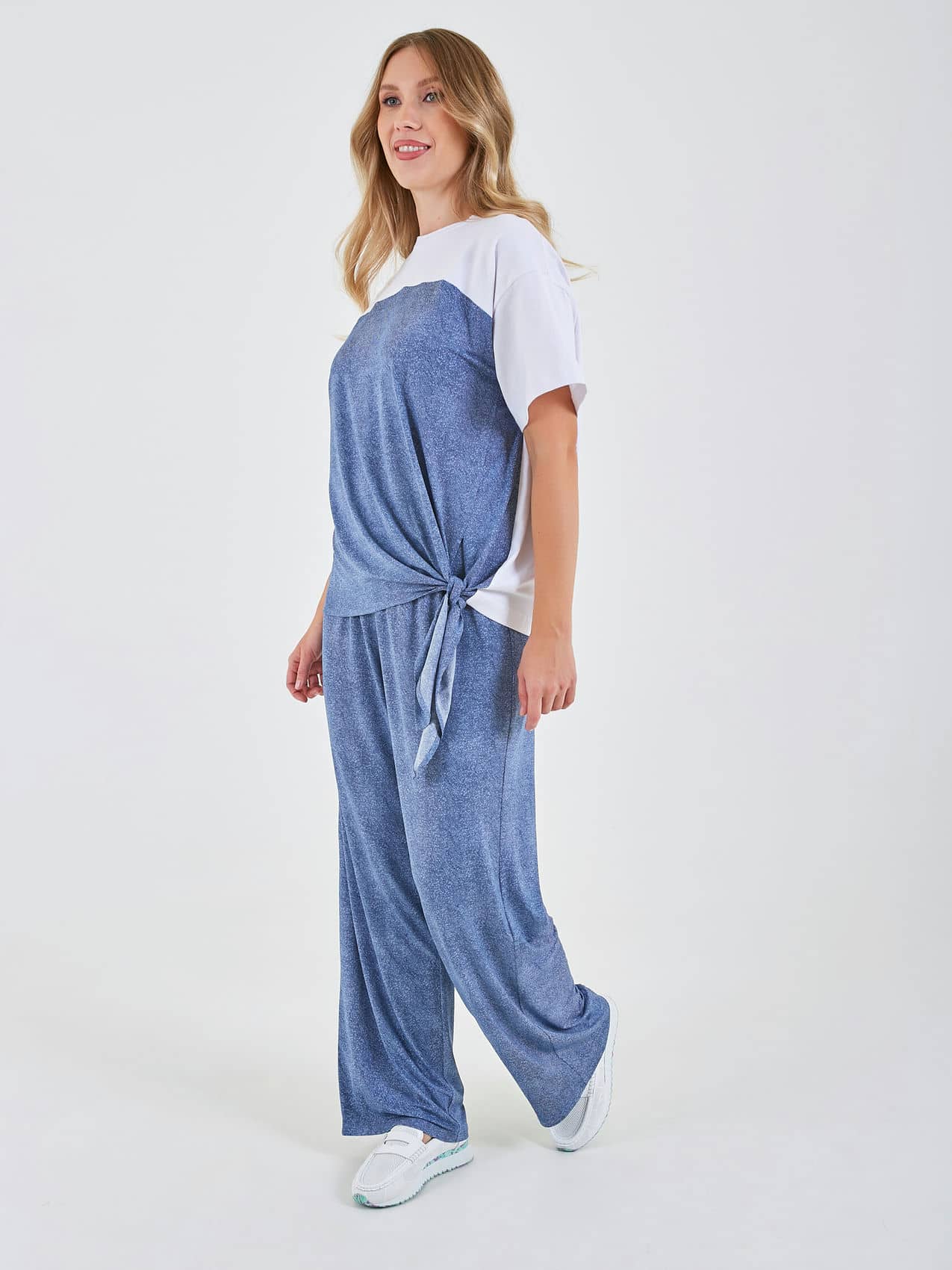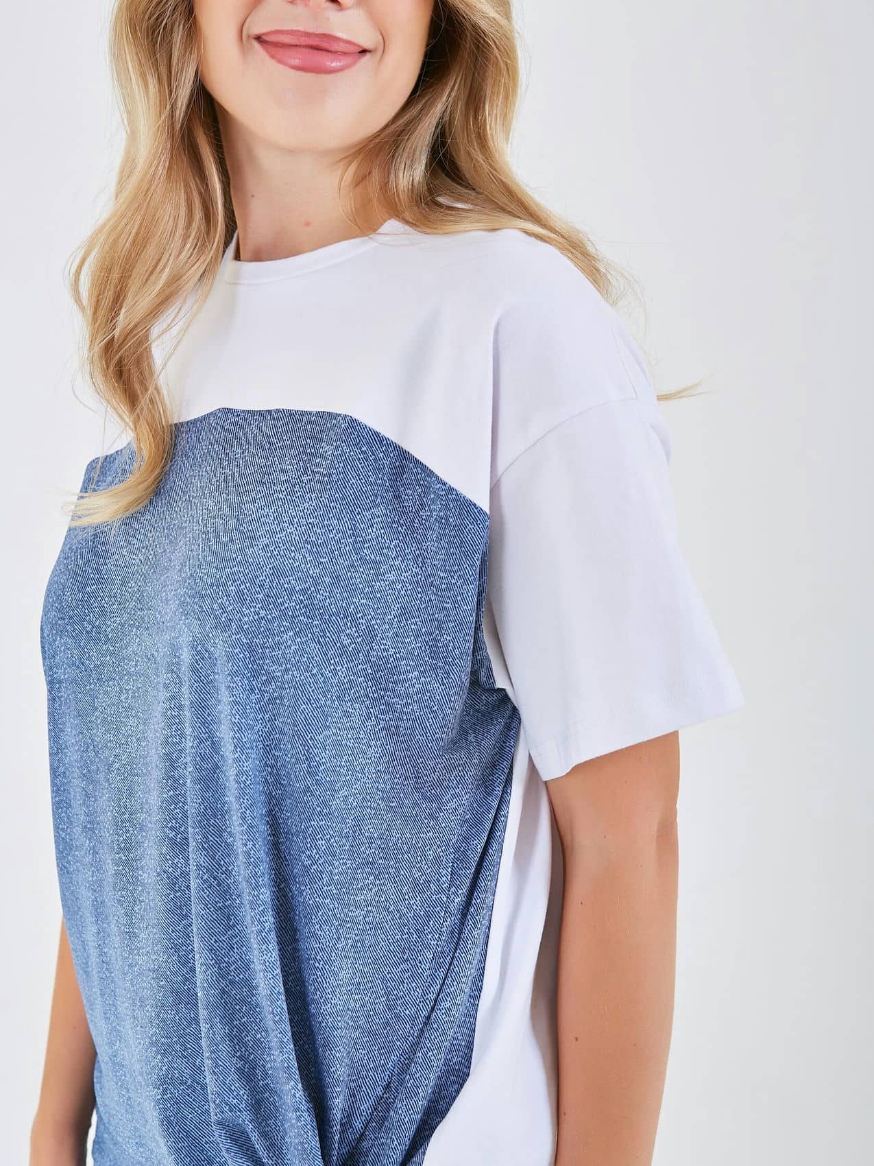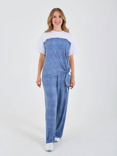 Футболка выполнена в стиле колор-блок, с белыми рукавами и темной основной частью, создающей контрастный эффект. Она имеет свободный крой и элемент завязки сбоку, что придает ей стильный и модный вид. Коллекция Весна-Лето 2025. Капсула "Сен-Тропе". Параметры модели: 89-70-92, рост 167, размер 44-46