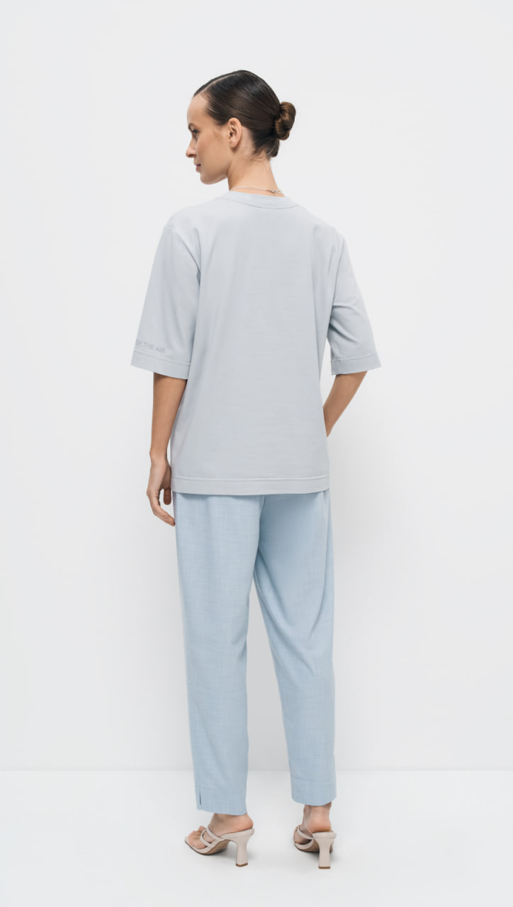 Блуза прямого силуэта из мягкого хлопка с добавлением эластана в спокойном цвете «серый мел» привлекает внимание благодаря своему уникальному дизайну. Полочка украшена двумя вертикальными рельефами, в которые заложена нагрудная вытачка, подчеркивающая изящную линию груди. Втачные одношовные рукава, длиной чуть ниже линии локтя, дополняют гармоничный силуэт и делают образ элегантным и утонченным. Объемная печать на рукаве, выполненная в тон основному материалу, несет в себе девиз коллекции, придавая изделию особую значимость и индивидуальность.