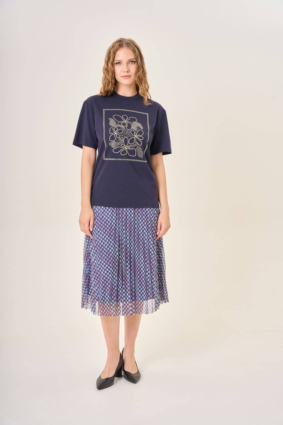 Футболка обладает классическим втачным рукавом и выполнена из более плотного трикотажа, чем летние варианты. Благородный чернильно-чёрный оттенок выгодно подчёркивает оригинальную аппликацию из золотых страз, придавая изделию дороговизну и шик. Футболка подойдёт женщинам разных фигур, идеально вписываясь в городской стиль и позволяя создать стильный и утончённый образ.