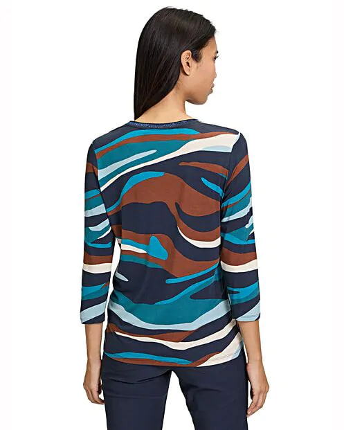 Кофта сочетает в себе яркий стиль и максимальный комфорт. Её рукава три четверти добавляют лёгкости и современности, а абстрактный узор из темно-синих, бирюзовых, коричневых и белых волнистых полос создаёт неповторимый визуальный эффект. Такая модель станет прекрасным дополнением вашего гардероба, позволяя создавать интересные и оригинальные образы, которые обязательно обратят на вас внимание и подчеркнут вашу индивидуальность.