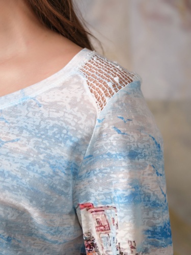 Футболка из мягкой и приятной к телу ткани. Интересная фактура ткани позволяет создать необычный образ. Прямой покрой не сковывает движения и скрывает недостатки фигуры. Круглый вырез горловины. Футболка украшена декоративными вставками на плечах и по нижней части переда. Разрезы по бокам, удлиненная спинка. Яркий принт с морскими мотивами. Данная футболка будет удачно сочетаться с брючным комплектом.