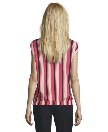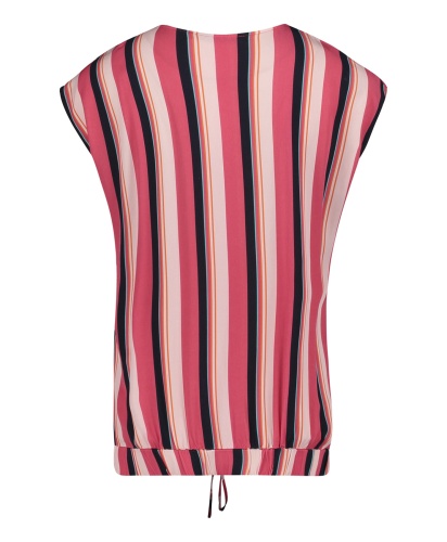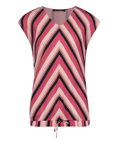 Новое воплощение тренда на полоску! Топ прямого покроя. Эластичная лента фиксирует низ изделия. V-образный вырез горловины, короткие цельнокроеные рукава. Вискозный материал приятен к телу и обеспечивает максимальный комфорт. Этот топ - стильный компаньон для любого однотонного низа.
