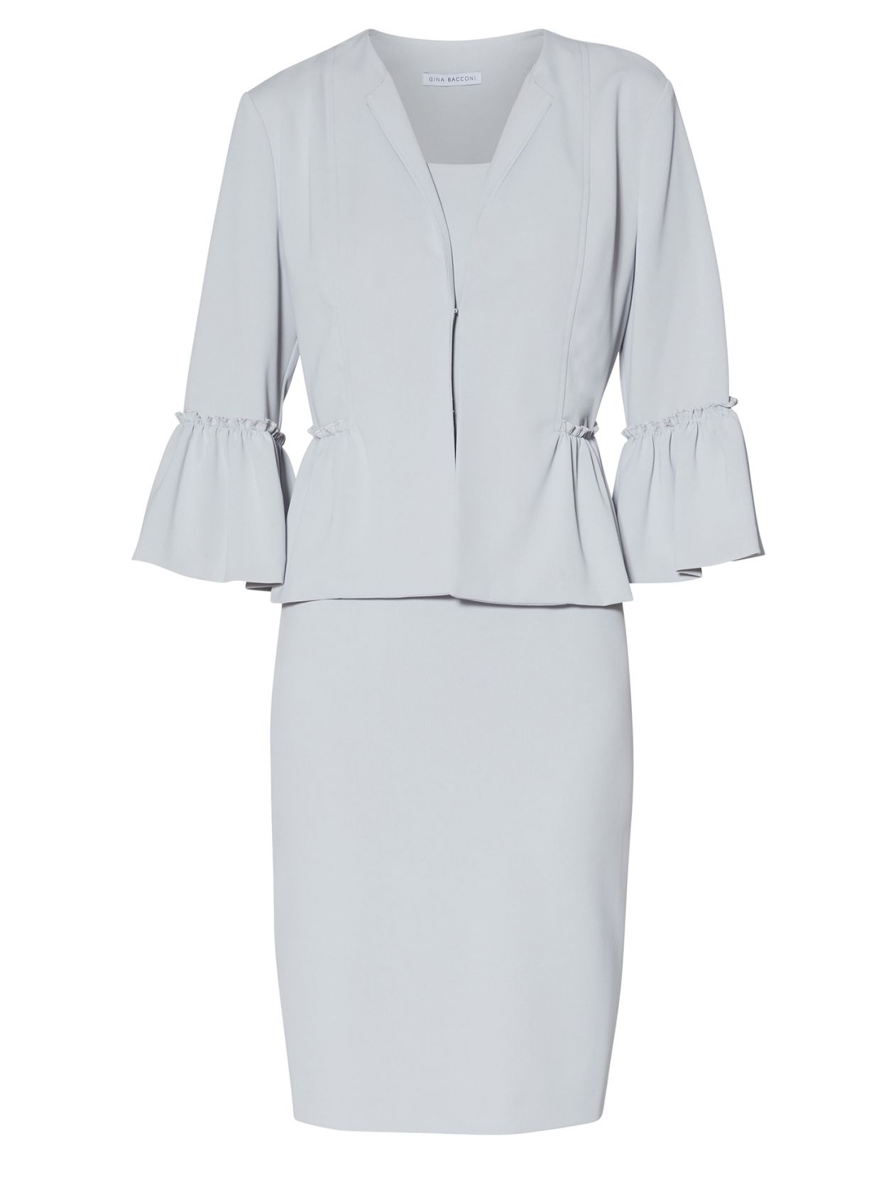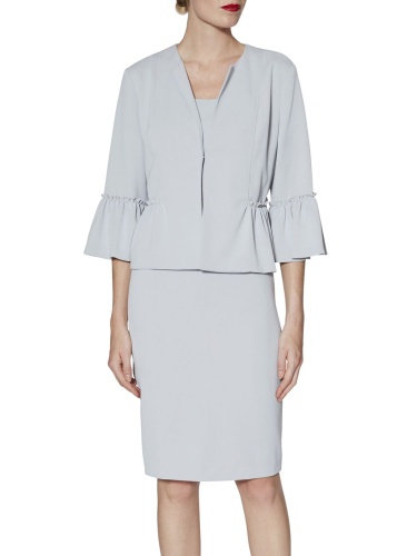 Приталенное платье сочетается с красиво скроенным жакетом из той же ткани. Жакет присборен на рукаве и на талии для создания эффекта баски. Платье полностью на подкладке и застегивается на потайную молнию сзади. Куртка застегивается на невидимые крючки спереди.