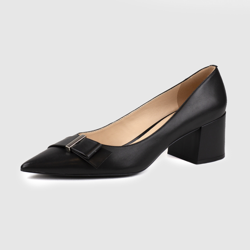 Черные туфли из натуральной кожи. Заостренные носы с декоративным ремешком. Широкий устойчивый каблук. Высота каблука: 6 см. Туфли подойдут для классического образа в деловом стиле или торжественного мероприятия.