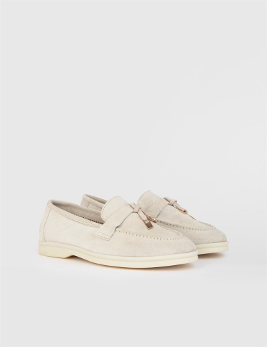 Бежевые замшевые кожаные женские лоферы. Изготовлено из высококачественной телячьей кожи. Bысота подошвы: 2,5 см. Резиновая подошва. Ручная работа.